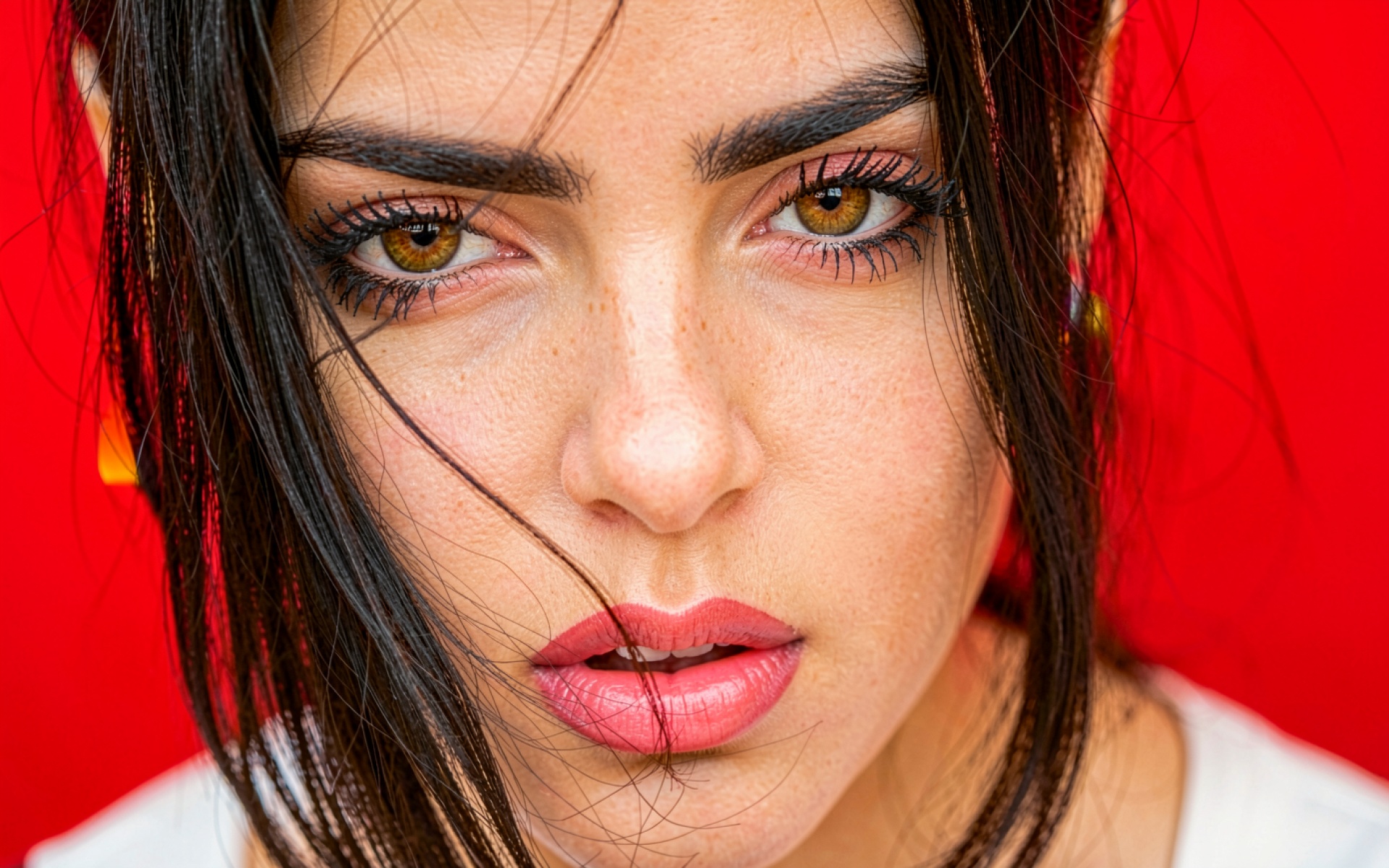 Доступны для скачивания JPG обои Портрет девушки с темными волосами на красном фоне. Почему стоит скачать их? Другие сайты обрезают края, но у нас доступен полный кадр.