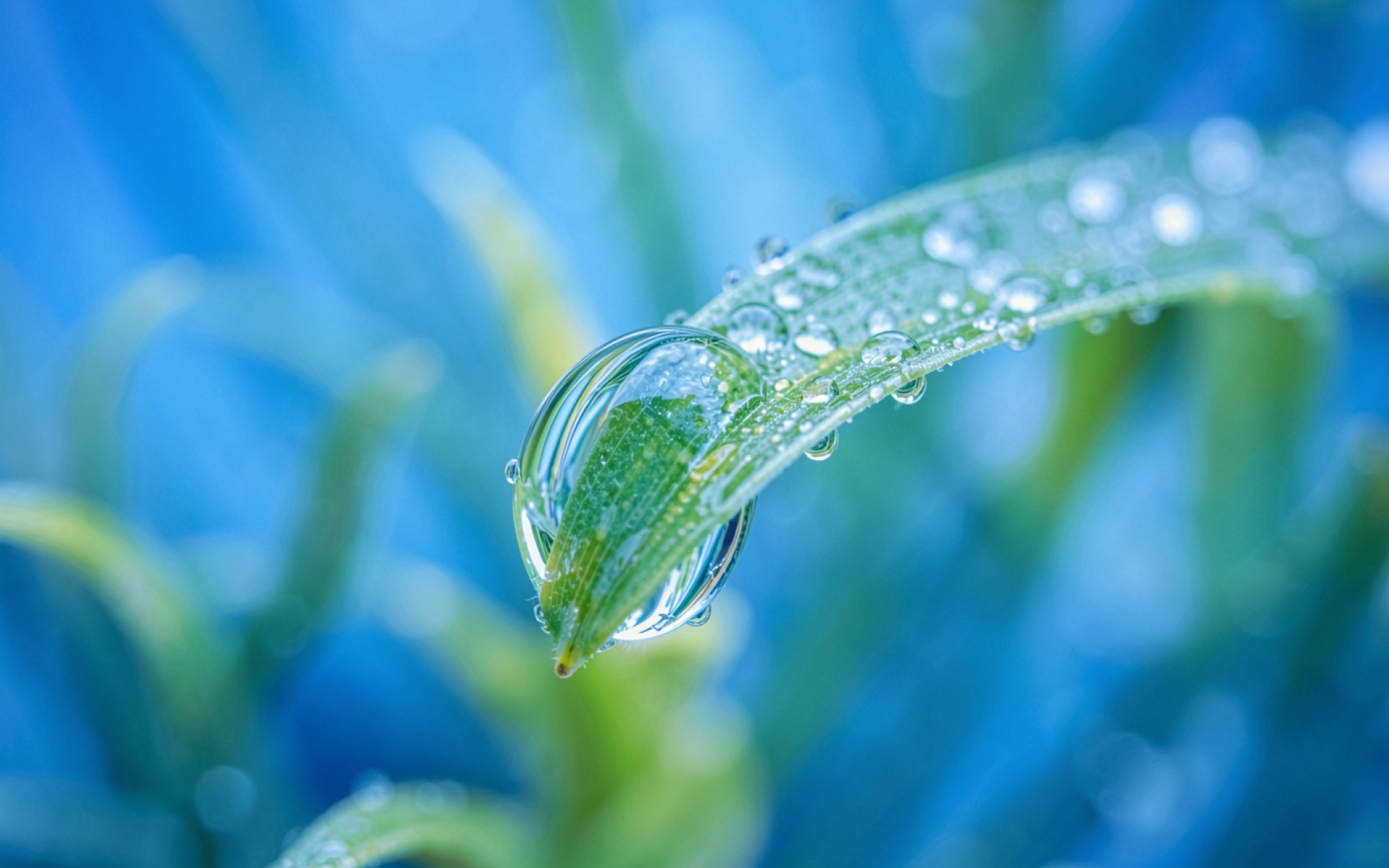 Изображение фокусируется на сферической форме капли, которая работает как естественная линза, преломляя свет. Текстура листа передана через четкие прожилки и микроскопические ворсинки, создающие контраст с гладкой поверхностью воды. Мягкий голубой градиент фона подчеркивает свежесть утреннего освещения, а блики на поверхности капли добавляют объему. На сайте доступен удобный предпросмотр перед скачиванием для оценки качества на экране.