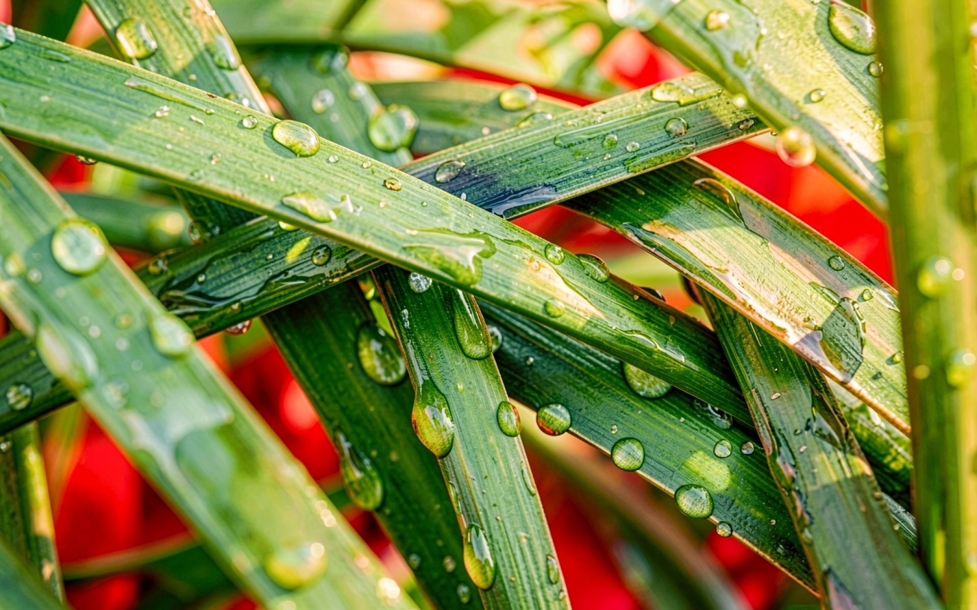 Изображение детально передает глянцевую текстуру растительных волокон и сферическую форму водяных капель. Освещение создает четкие блики на поверхности воды, а мягкие градиенты зеленого переходят в насыщенный красный фон. Контрастные тени подчеркивают объем каждого листа. На сайте доступен удобный предпросмотр перед загрузкой для оценки качества отображения на вашем экране.