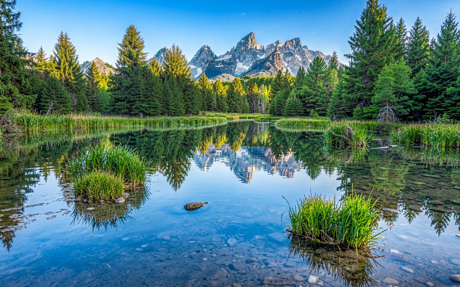 Наш сайт предлагает скачать обои Горные вершины в хвойном лесу у озера в JPG, и причина проста: эта JPG версия сохраняет все оттенки теней и света.