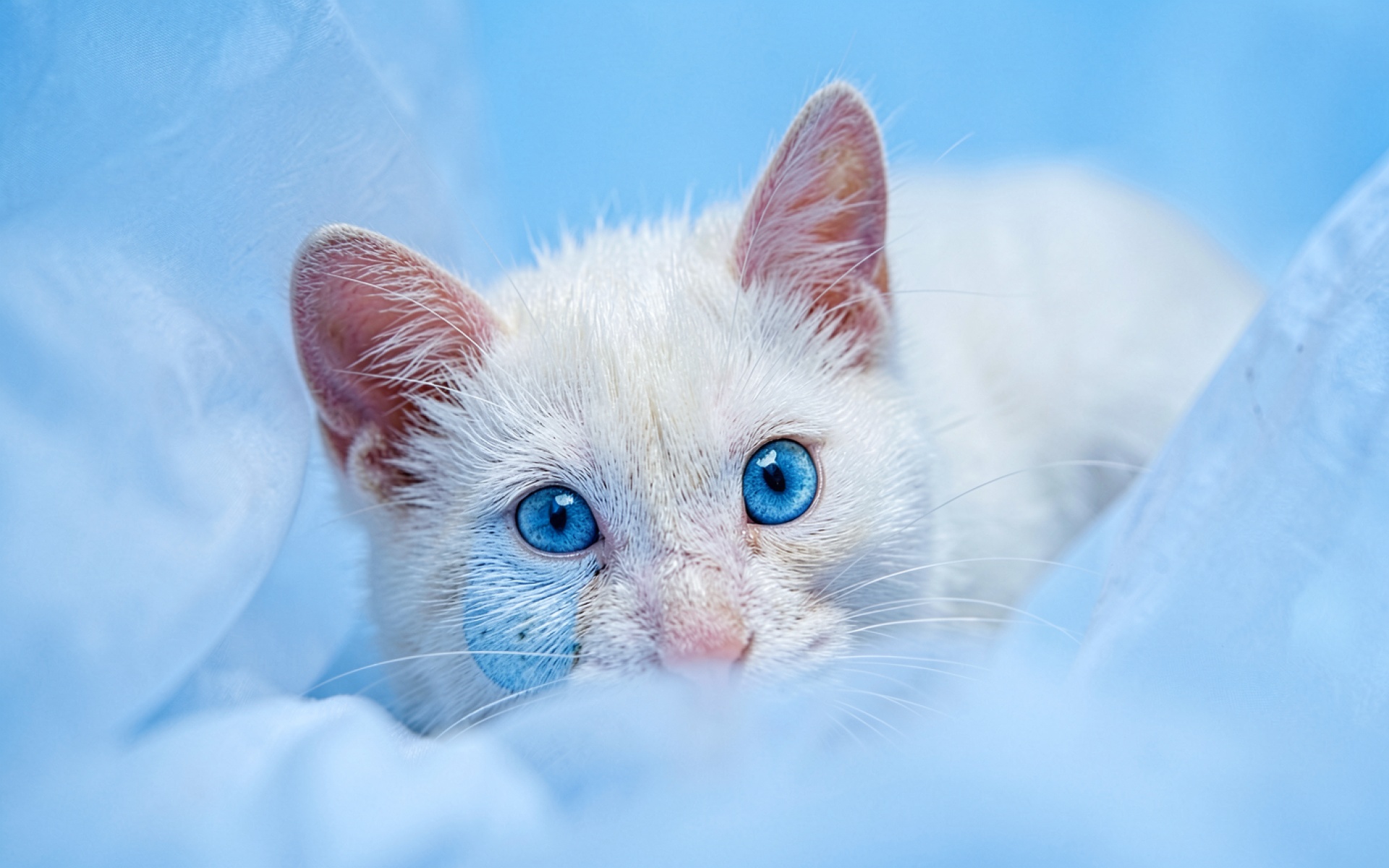 Доступны для скачивания JPG обои Белый котенок с голубыми глазами в ткани. Почему стоит скачать их? изображение подверглось минимальному сжатию, что позволило сохранить все мелкие детали.