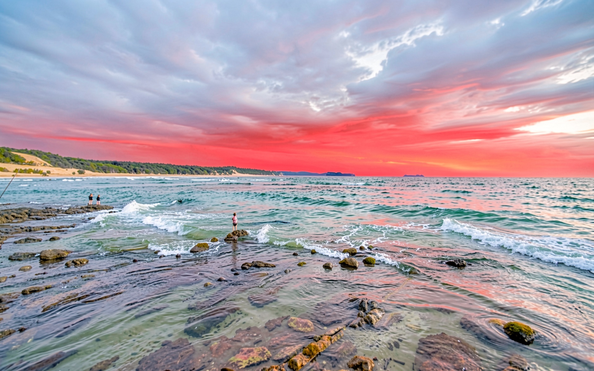 Изображение отличается детальной проработкой текстуры мокрых прибрежных камней и динамикой морской пены. Освещение характеризуется мягким градиентом от насыщенного красного в зените до глубокого синего у горизонта, что создает выразительный контраст. Тени в нижней части кадра подчеркивают рельеф скал, а блики на поверхности воды передают зеркальный эффект неба. На сайте доступен удобный предпросмотр перед загрузкой для оценки качества отображения на вашем экране.