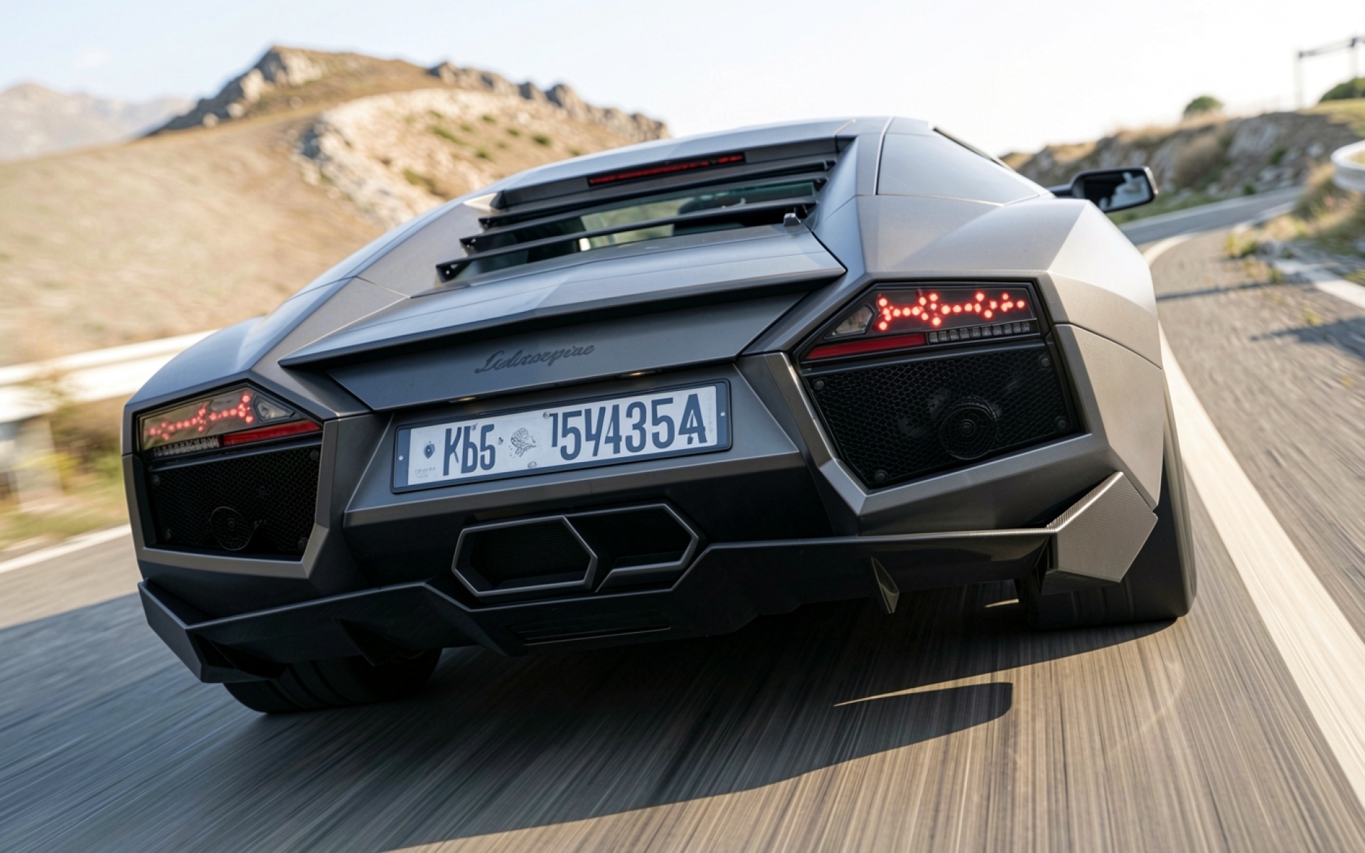 Серый суперкар Lamborghini на горной дороге обои
