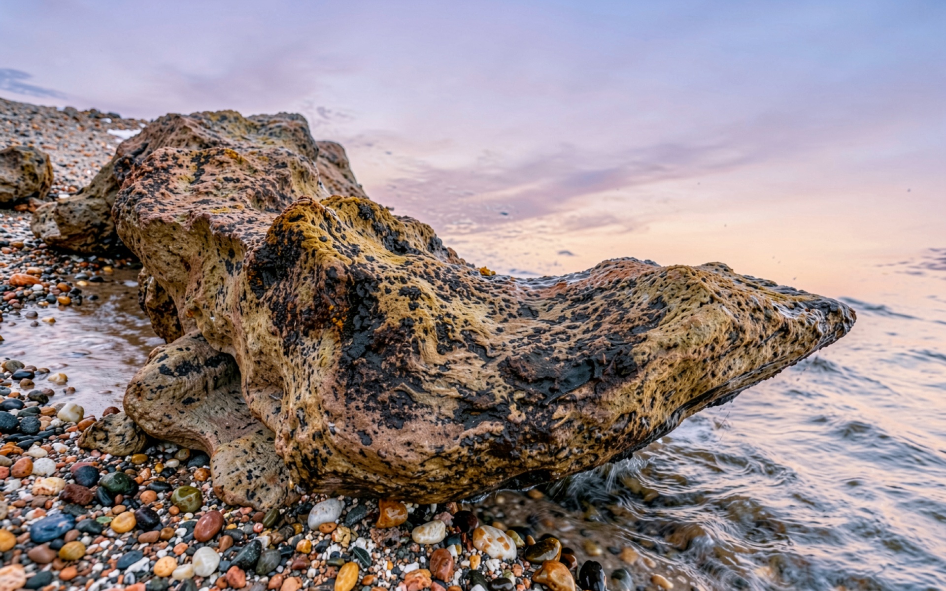Изображение детально передает шероховатую текстуру камня, подчеркивая каждую пору и трещину через контраст света и тени. Мягкий градиент закатного неба отражается в мокрой гальке и поверхности воды, создавая естественные блики на выступающих частях скалы. Глубокие темные оттенки в углублениях породы подчеркивают объем объекта на фоне светлого горизонта. Перед загрузкой доступен удобный предпросмотр для оценки качества отображения всех элементов сцены на вашем экране.