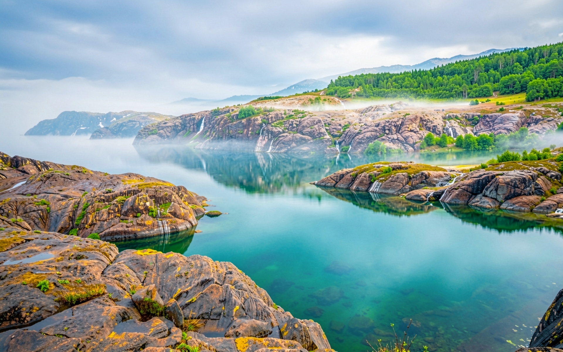 Техническое исполнение кадра акцентирует внимание на грубой текстуре гранитных пород и плавных градиентах бирюзовой воды. Освещение рассеянное, что минимизирует жесткие тени и подчеркивает мягкие переходы тумана между скалами и хвойным массивом. Контраст между темными мокрыми камнями и светлой дымкой создает глубину пространства. Перед загрузкой на сайте доступен удобный предпросмотр для оценки качества отображения на вашем экране.