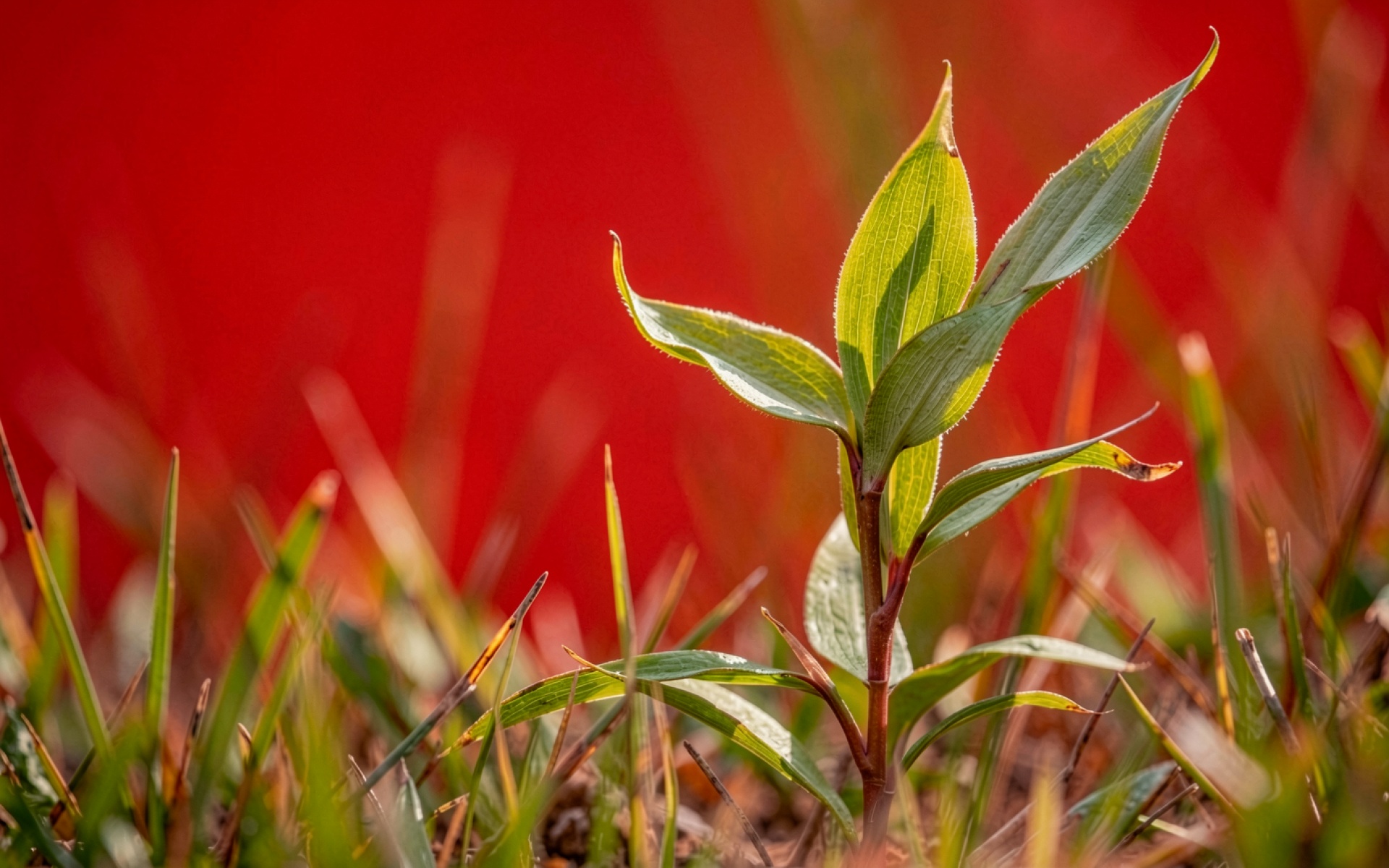Согласно данным с botanicalgarden.org, хлорофилл в молодых листьях растений эффективно поглощает синий и красный спектры света для фотосинтеза, что делает ярко-зеленый цвет максимально насыщенным при контрасте с красным фоном. Нажмите кнопку скачивания, чтобы установить эти обои с ростком на ваш ПК или телефон прямо сейчас.