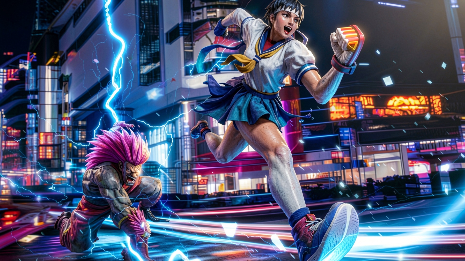 Изображение отличается детальной проработкой текстур кожи персонажей и глянцевых поверхностей городского ландшафта. Динамическое освещение создает резкие контрасты между неоновыми вывесками и глубокими тенями в переулках, а градиенты ночного неба подчеркивают атмосферу футуризма. На сайте доступен удобный предпросмотр перед загрузкой для оценки качества на экране.