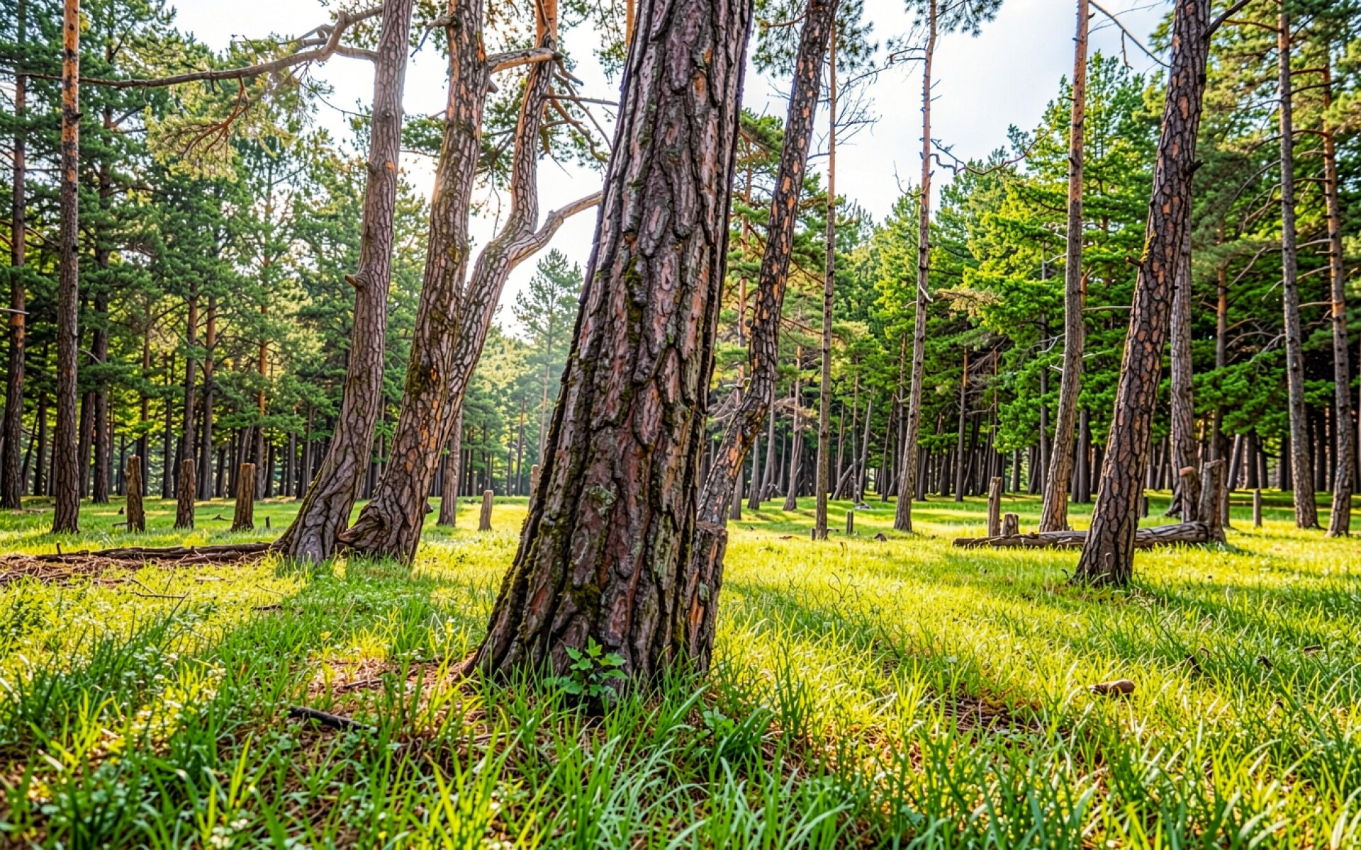 Изображение детально передает грубую текстуру коры сосен и мягкий ворс лесной травы. Контрастное освещение создает четкие тени на земле и яркие блики на стволах деревьев, а плавные градиенты фона подчеркивают глубину пространства. На сайте доступен удобный предпросмотр перед скачиванием для оценки качества отображения на вашем экране.