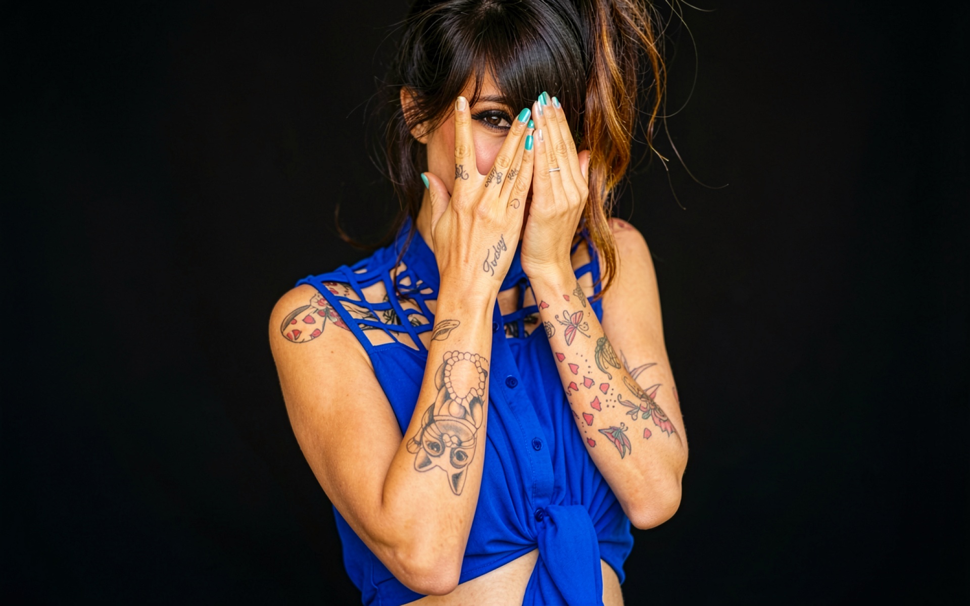 Девушка в синем топе с татуировками обои