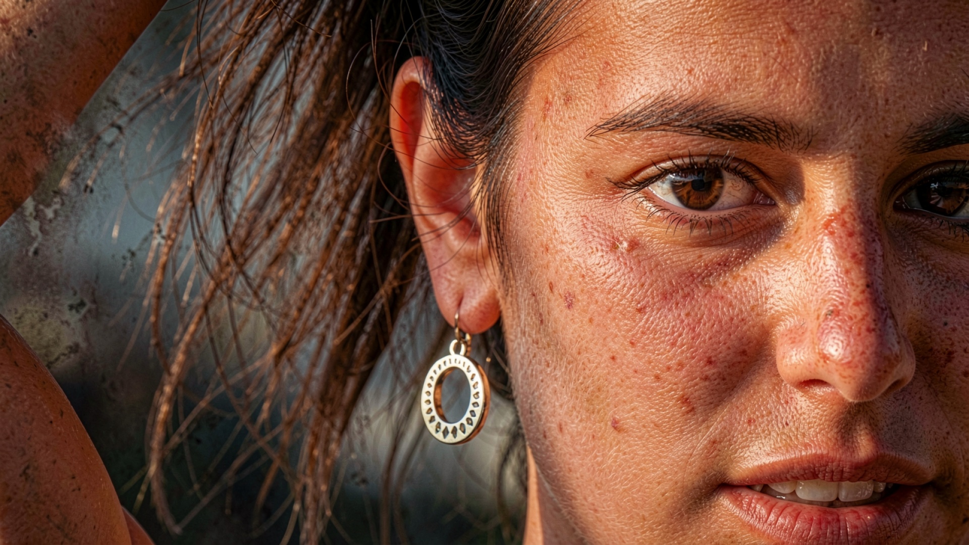 Технический анализ кадра показывает высокую плотность пикселей, что позволяет рассмотреть каждую пору и веснушку без артефактов сжатия. Освещение направленное, создающее мягкий объем и подчеркивающее глубину коричневых глаз. Согласно стандартам color-science.org, правильная цветопередача кожи в портретной съемке зависит от баланса белого и экспозиции теней. В данном случае используется естественный дневной свет, который минимизирует цифровой шум в темных участках волос и серьги.