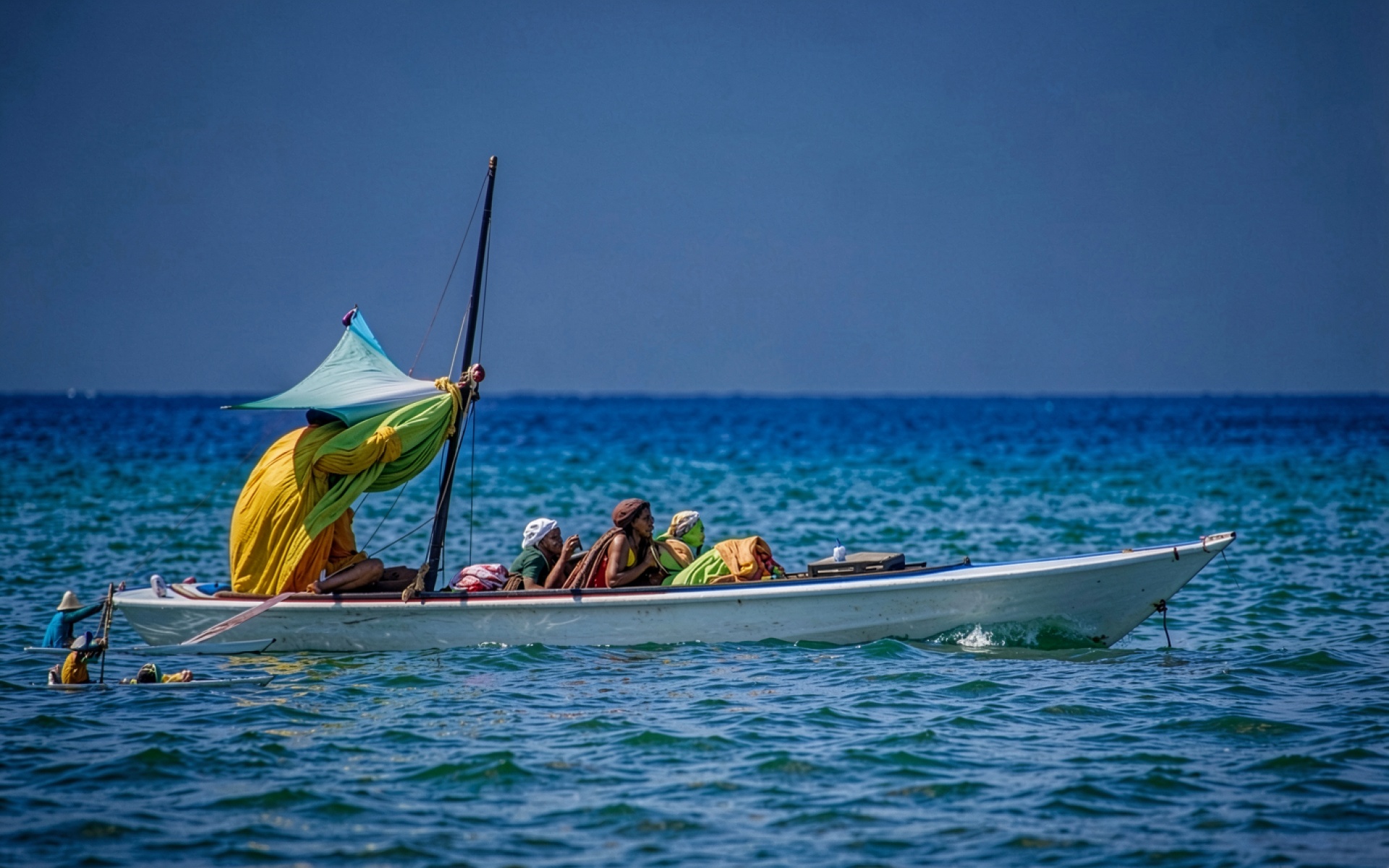 Белая лодка с людьми в синем океане обои