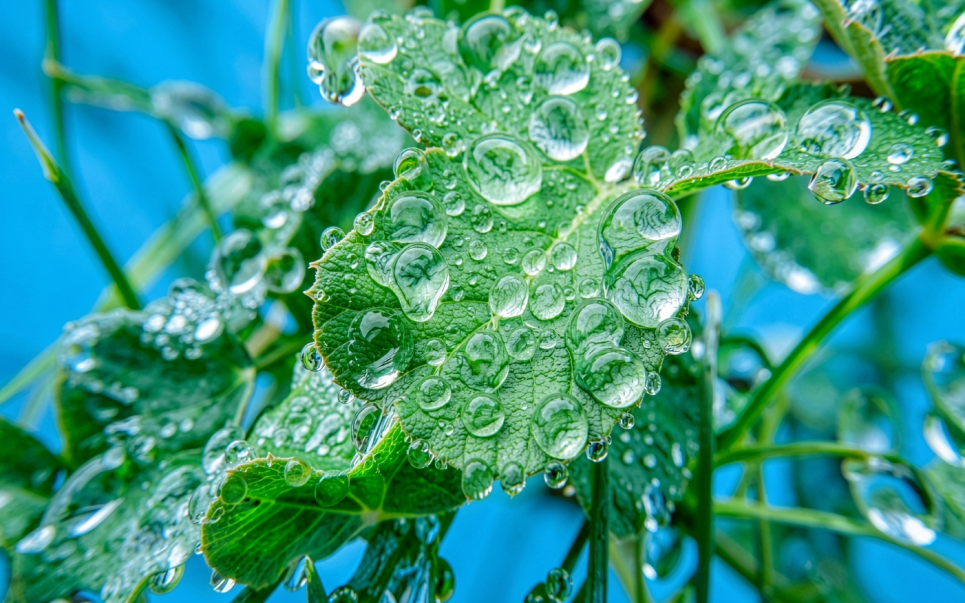 Изображение детально передает микрорельеф листовой пластины, подчеркивая прожилки и пористую структуру поверхности. Сферические капли воды работают как линзы, создавая четкие блики и глубокие отражения окружающего пространства. Мягкий градиент синего фона контрастирует с насыщенным зеленым цветом растительности, а распределение света создает объемный эффект. На сайте предусмотрен удобный предпросмотр перед скачиванием для оценки качества на экране.