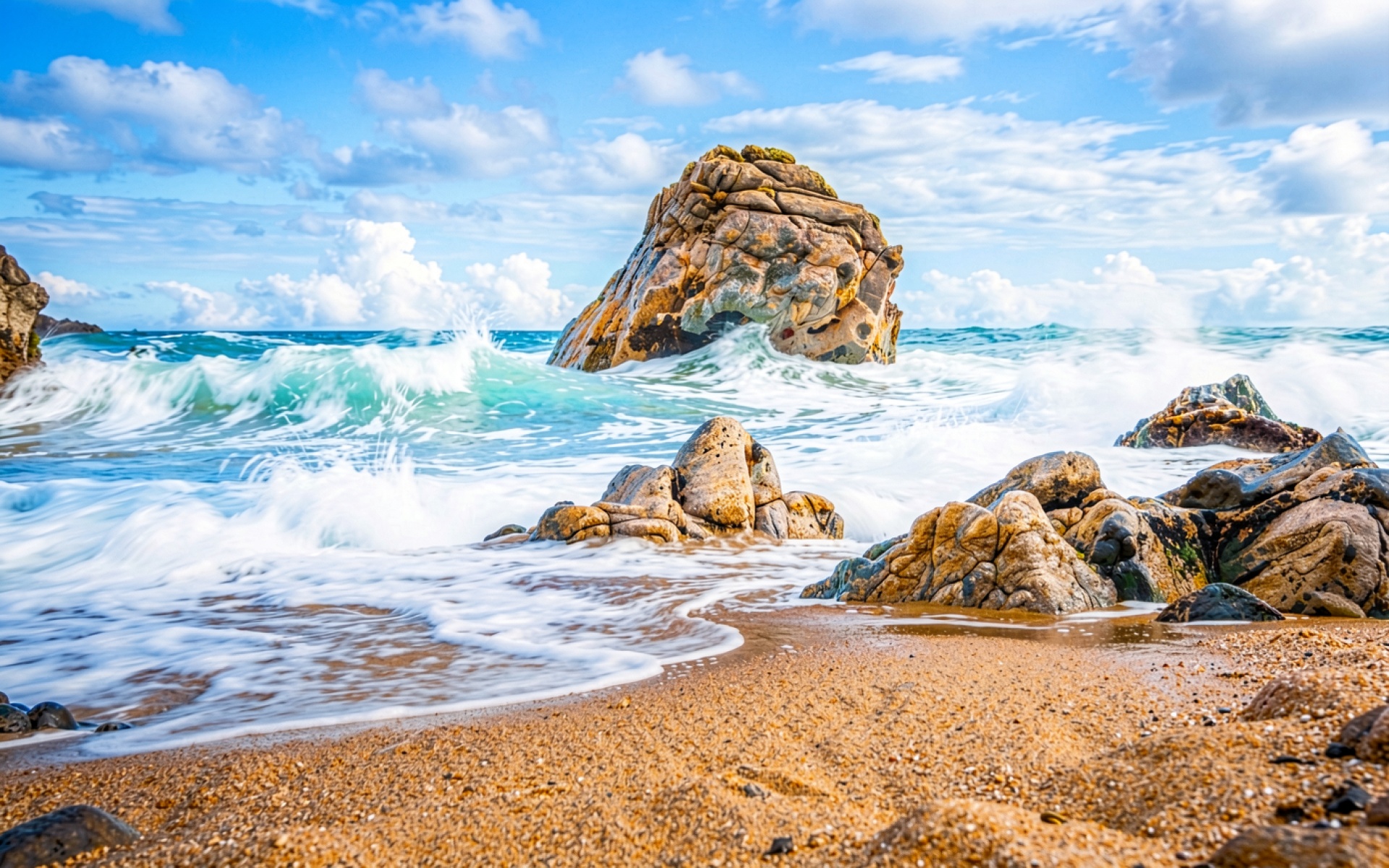 На нашем сайте вы можете скачать JPG файл обоев 'Скала в бирюзовом океане на песчаном пляже', и вот почему это важно: изображение прошло минимальное сжатие, что позволило сохранить все мелкие детали.