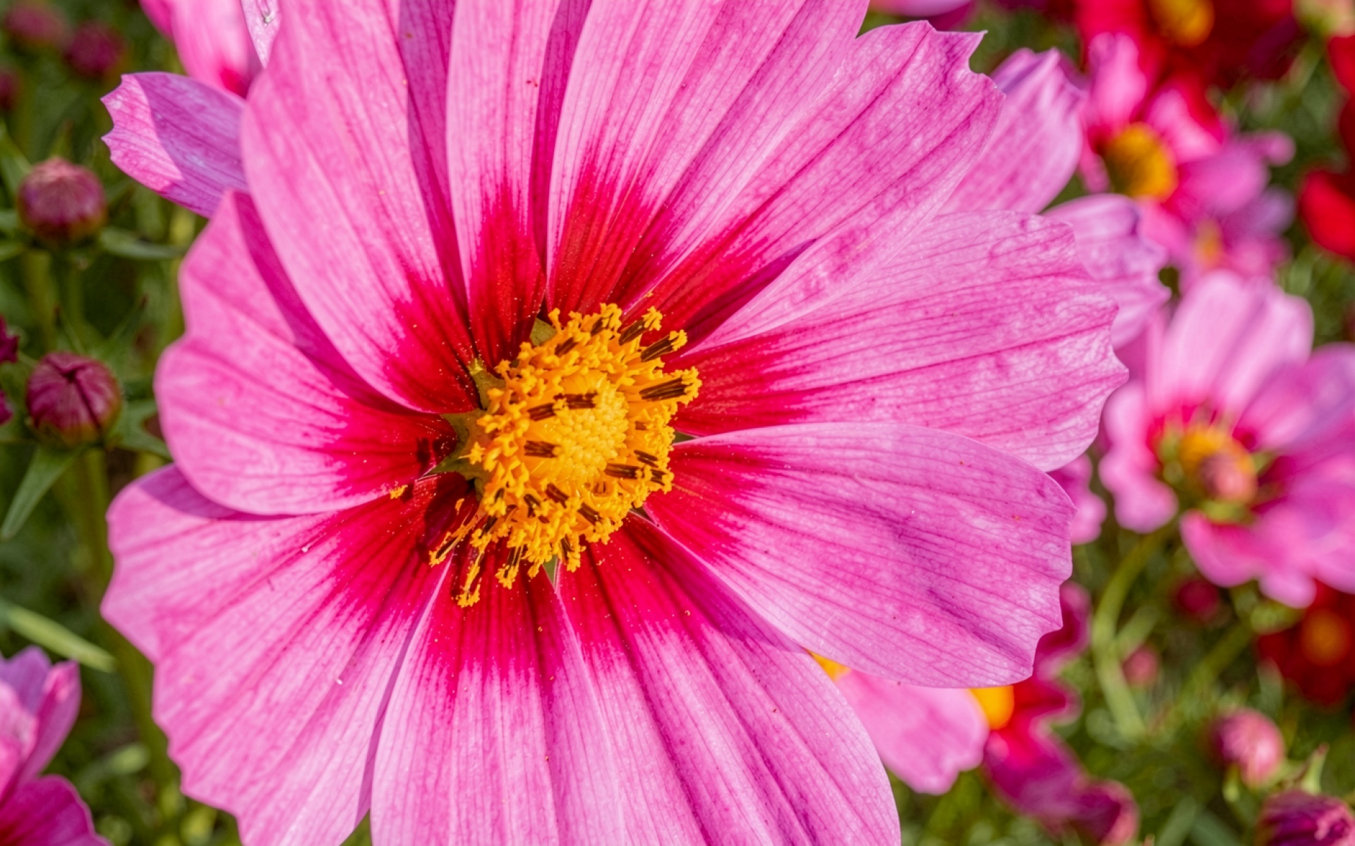 Скачайте с нашего сайта обои Розовый цветок космея в солнечном летнем саду в формате JPG, так как здесь нет полос градиента из-за низкого битрейта.