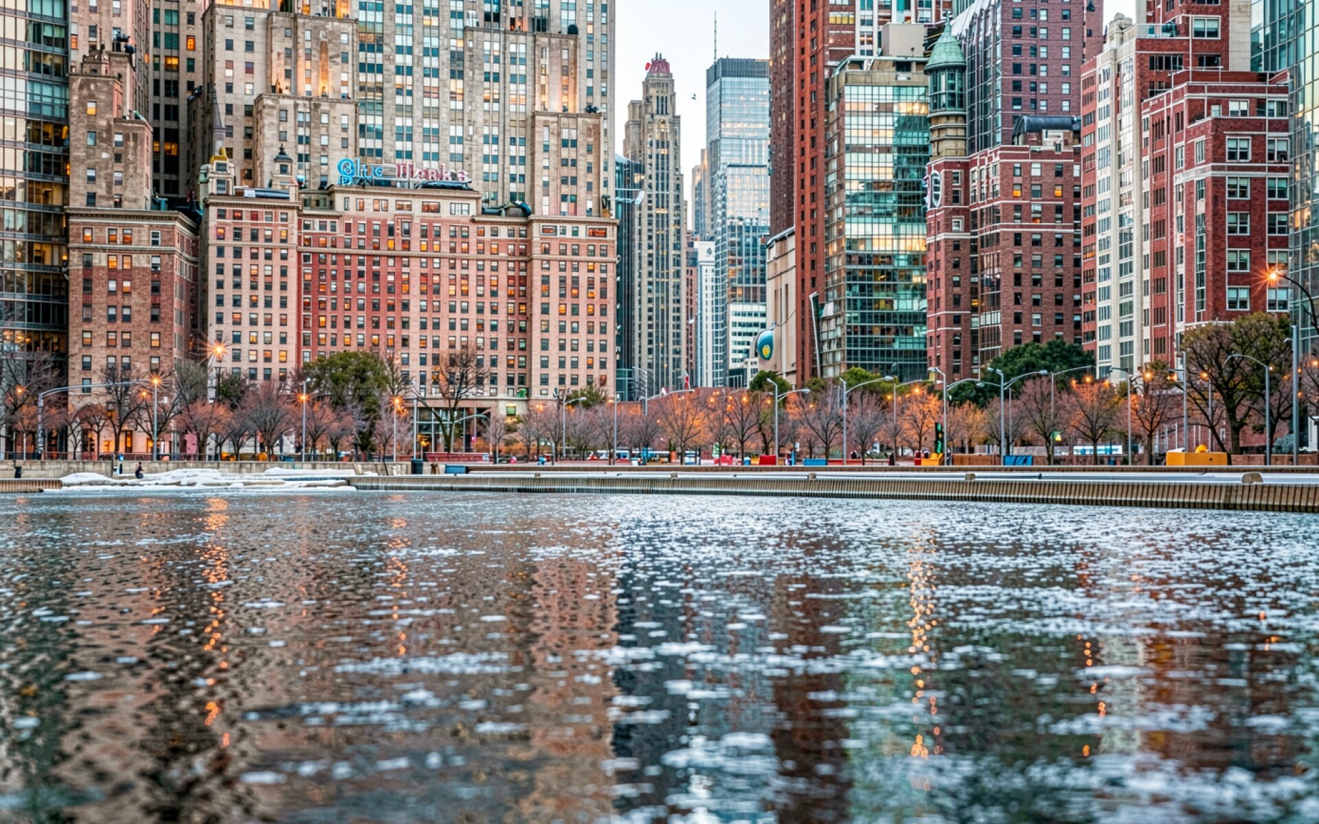 Техническое исполнение кадра акцентирует внимание на текстурах кирпичных фасадов и стеклянных поверхностей зданий. Вечернее освещение создает мягкие градиенты в небе и выразительные блики на поверхности воды с остатками льда. Контраст между теплыми огнями окон и холодными тонами городской среды подчеркивается глубокими тенями в архитектурных нишах. На сайте доступен удобный предпросмотр перед загрузкой, чтобы оценить качество отображения на вашем экране.