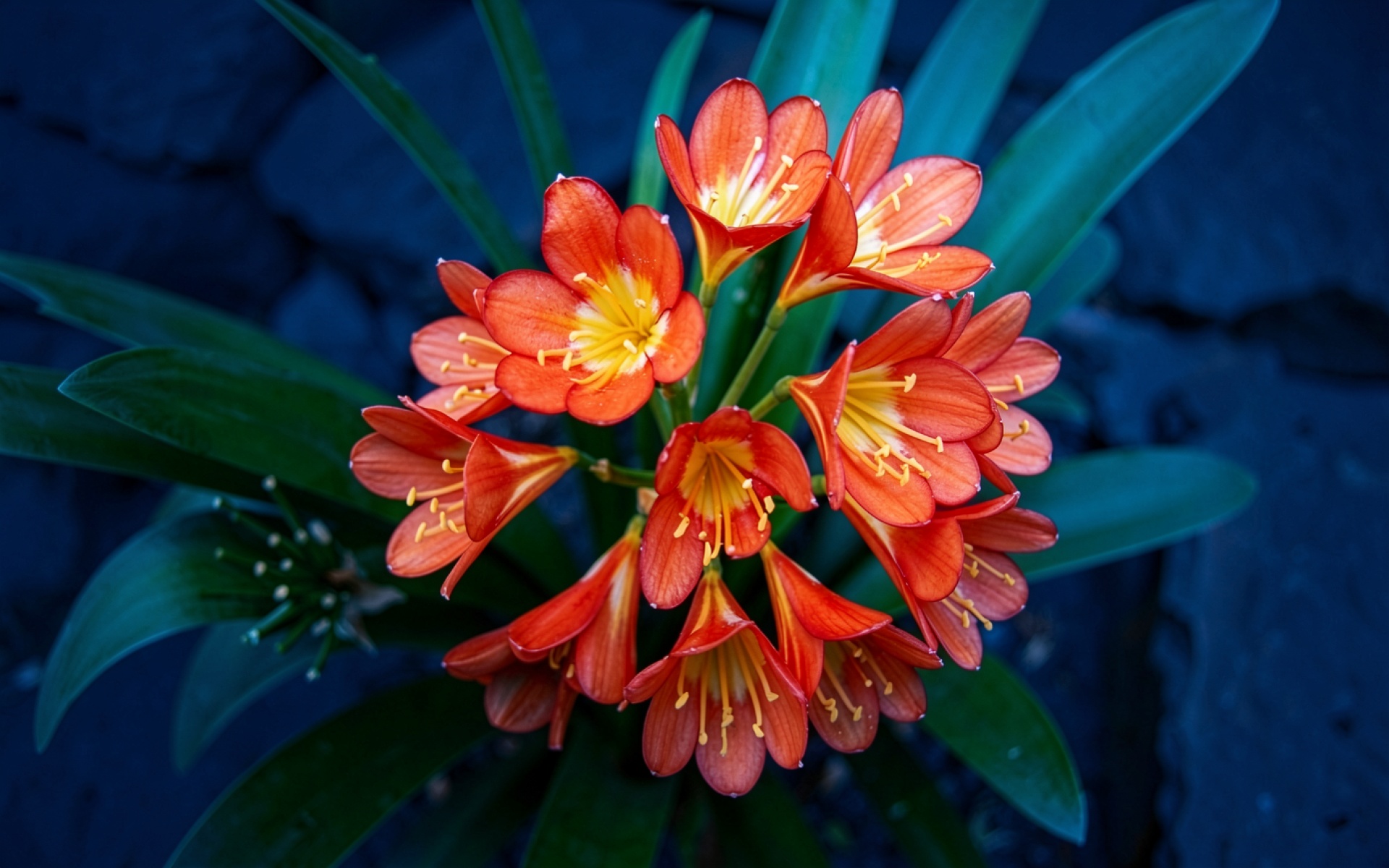 Оранжевые цветы клавеины на темно-синем фоне обои