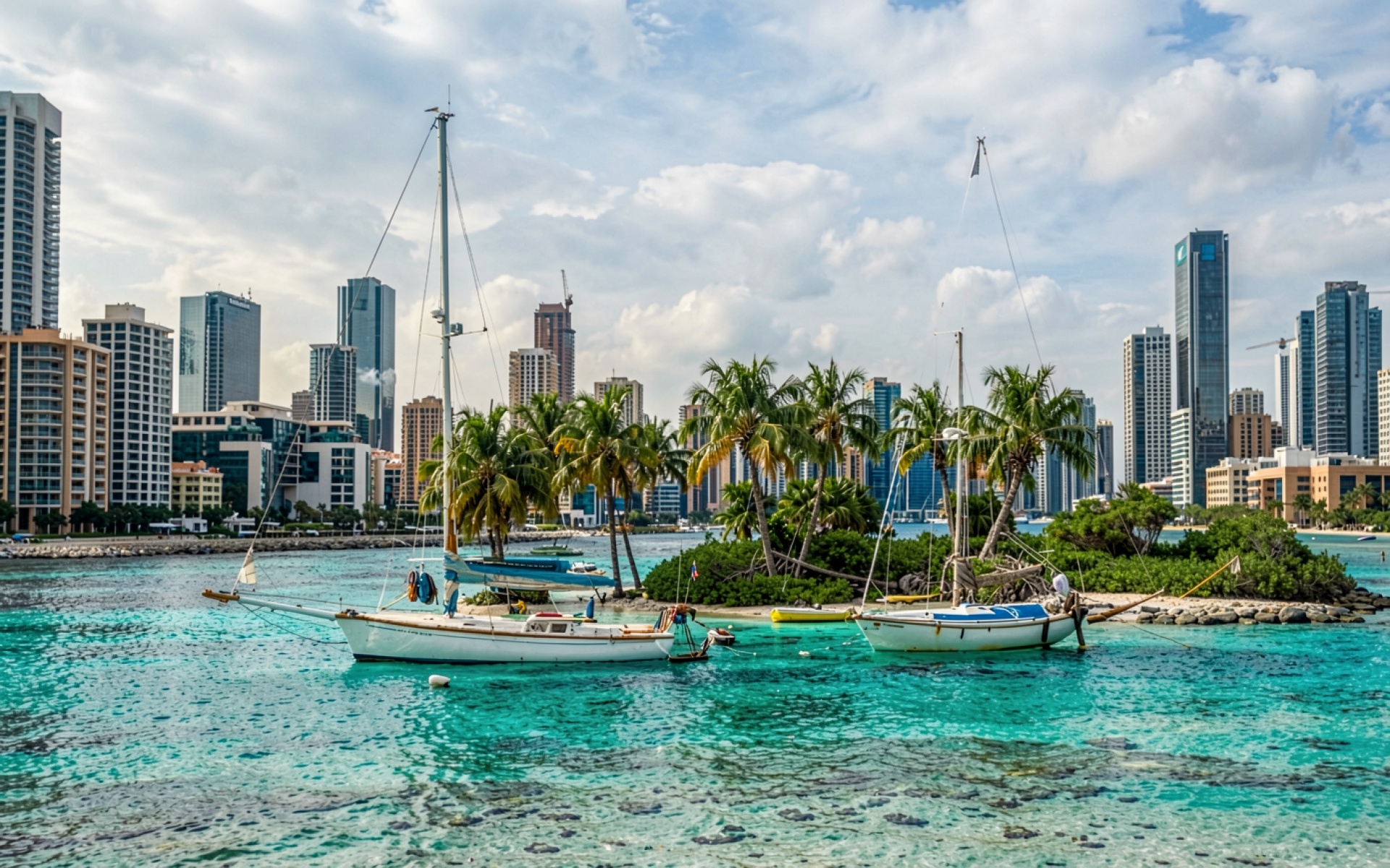 Изображение детально передает глянцевые поверхности корпусов судов и мягкие блики солнца на водной глади. Особое внимание уделено градиентам неба и контрасту между органическими формами пальм и строгими линиями городских небоскребов на заднем плане. Текстура воды отображена с высокой точностью, передавая прозрачность прибрежной зоны. Сайт предоставляет удобный предпросмотр перед скачиванием для оценки качества на экране.