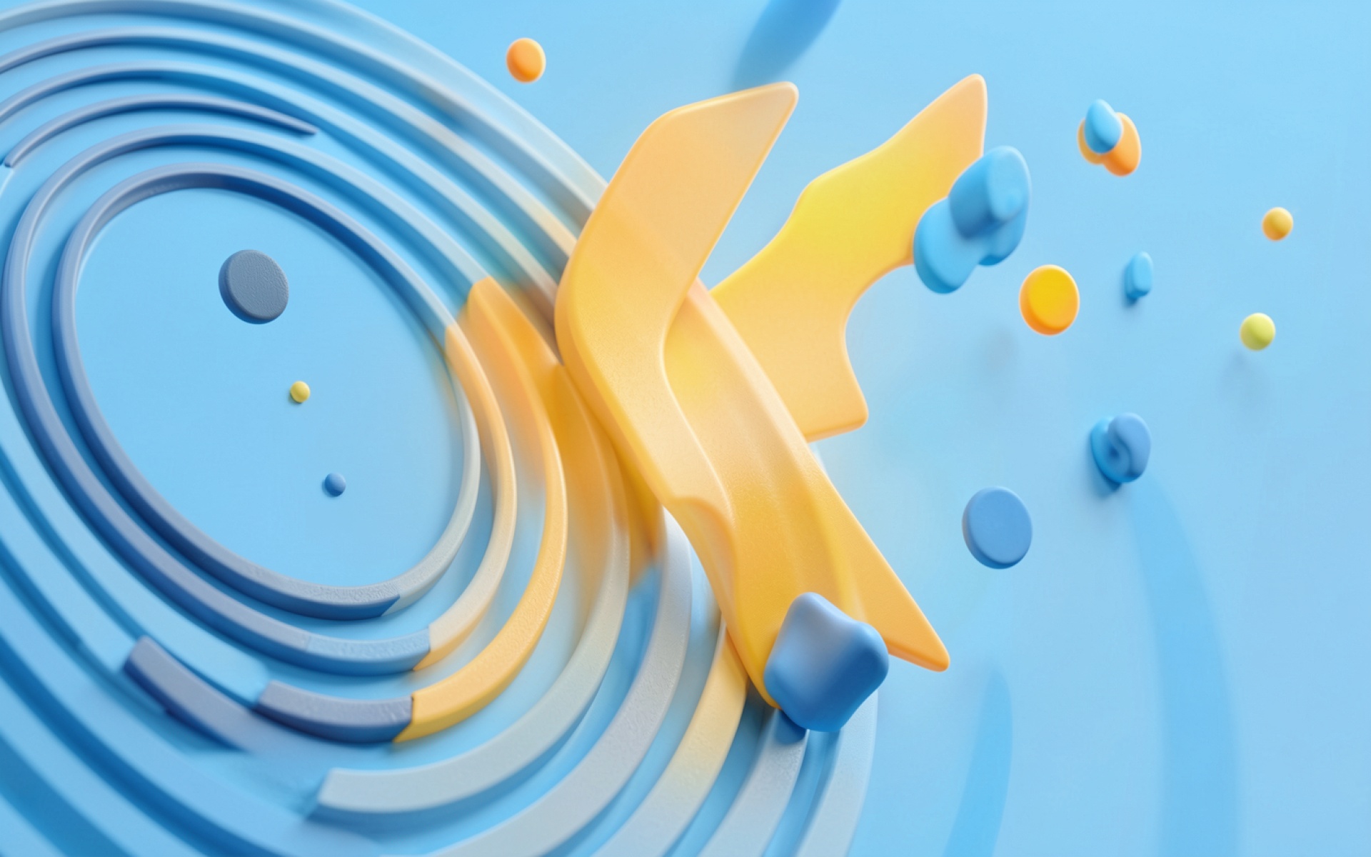 Изображение отличается проработкой матовых текстур и плавными градиентами фона. Освещение создает мягкие блики на изгибах центрального желтого элемента, а глубокие тени подчеркивают объем концентрических синих колец. Контраст между теплыми и холодными оттенками усиливает визуальную динамику сцены. На сайте доступен удобный предпросмотр перед загрузкой для оценки качества на экране.
