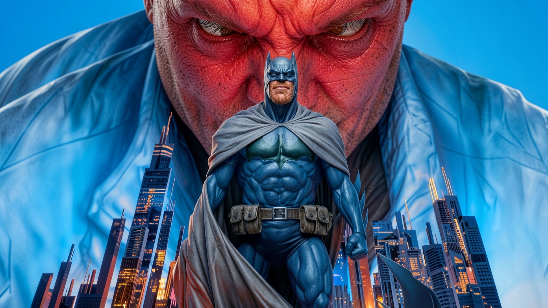 Доступны для скачивания JPG обои Бэтмен в синем костюме на фоне Готэма. Почему стоит скачать их? Другие сайты обрезают края, но у нас представлен полный кадр.
