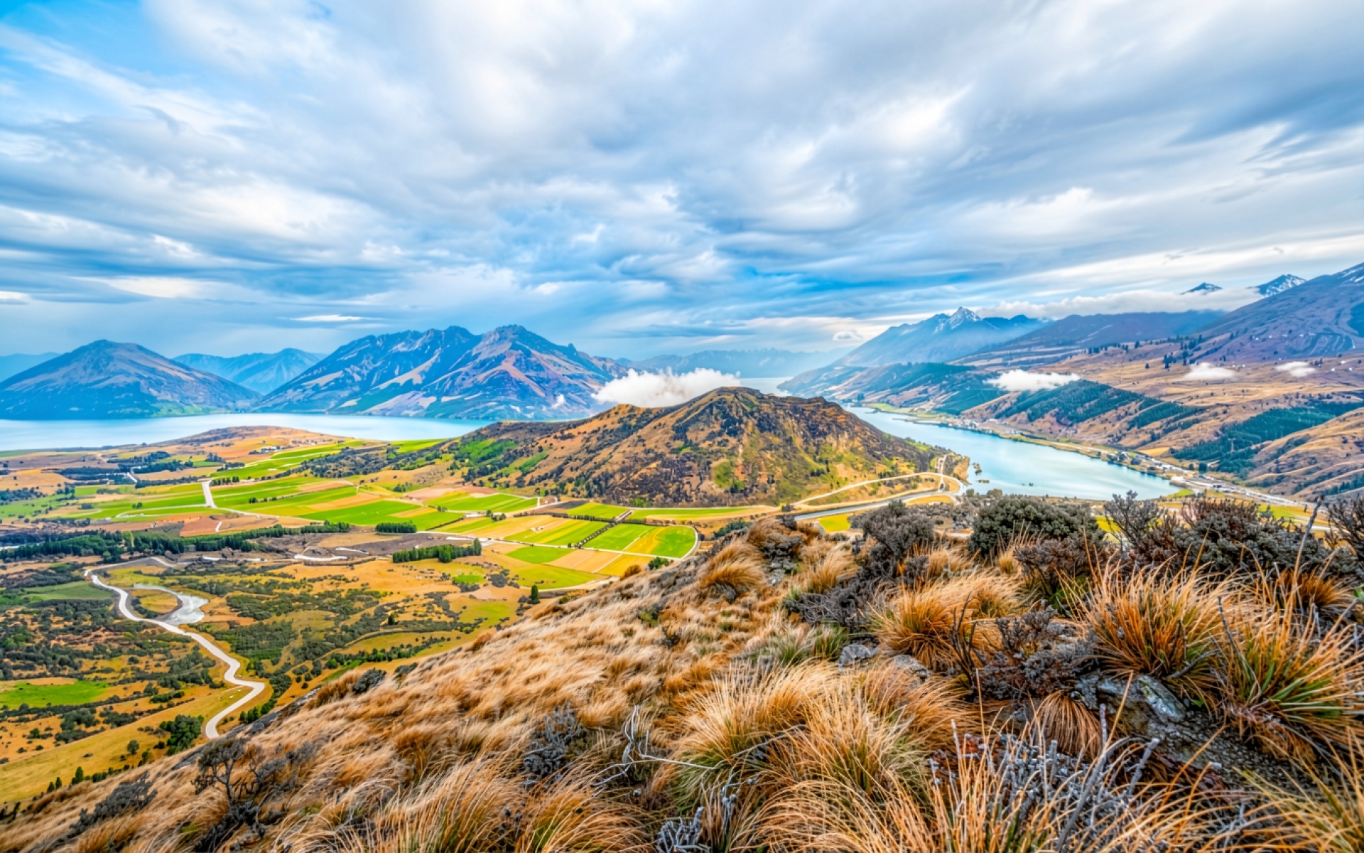 Изображение детально передает текстуру сухой травы на переднем плане и плавные градиенты голубого неба. Освещение подчеркивает рельеф горных склонов, создавая четкие переходы между освещенными участками и глубокими тенями в долинах. Контраст между ярко-зелеными полями и синевой воды создает сбалансированную композицию. На сайте доступен удобный предпросмотр перед скачиванием для оценки качества на экране.