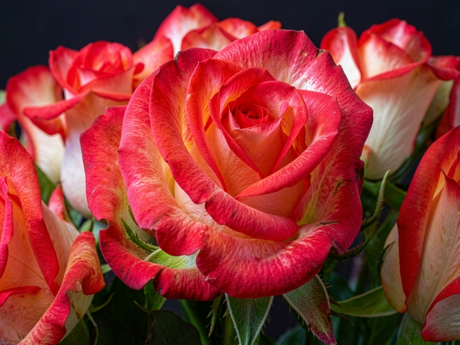 Изображение детально передает бархатистую текстуру лепестков, где плавные градиенты переходят от насыщенного алого к светло-желтому в сердцевине каждого цветка. Контрастное освещение создает глубокие тени между слоями бутонов и четкие блики на изгибах, подчеркивая объем композиции. Темный однотонный фон исключает визуальный шум, позволяя сфокусироваться на цветовых переходах. На сайте доступен удобный предпросмотр перед загрузкой для оценки качества на экране.