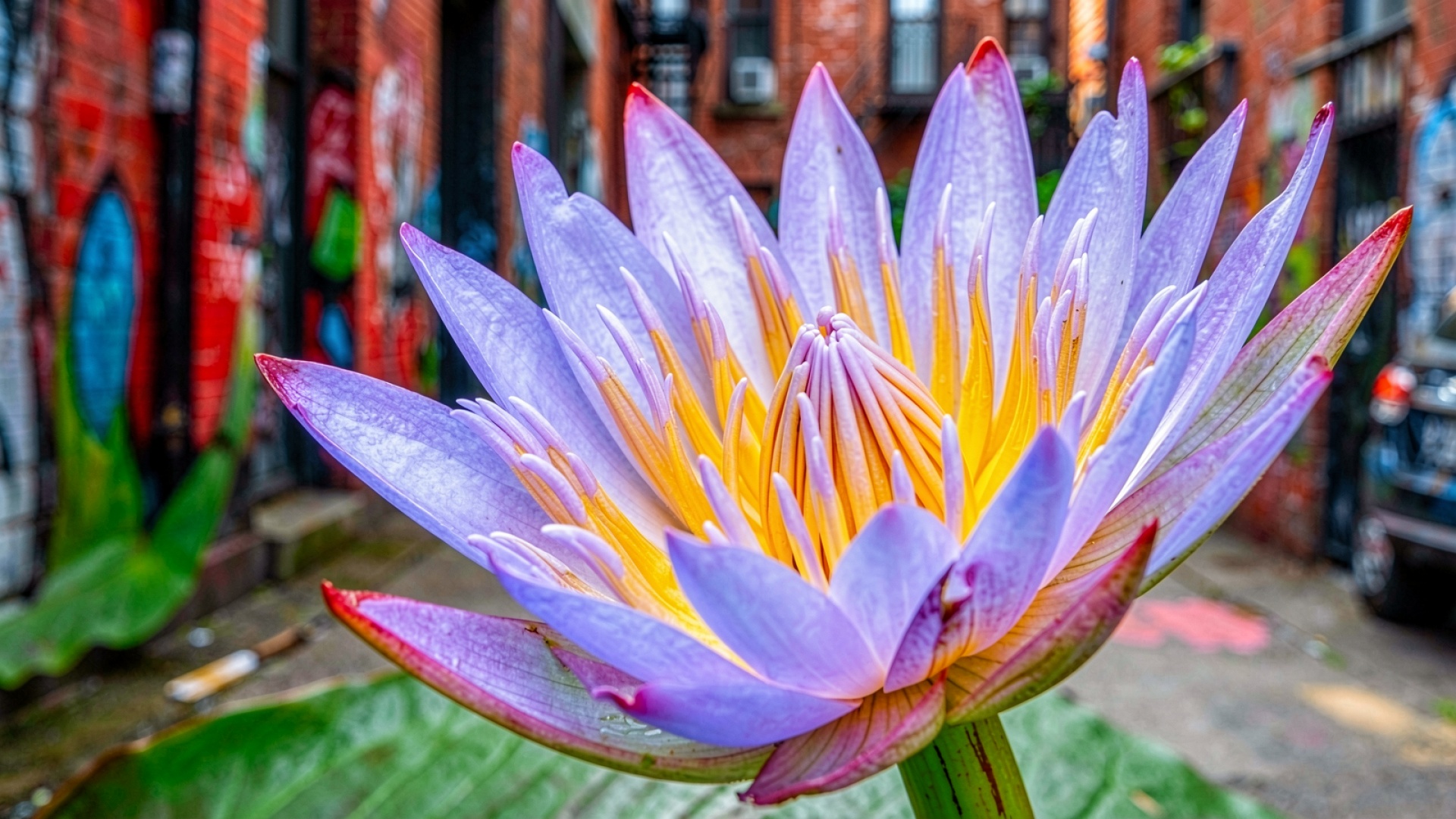Скачайте изображение фиолетового лотоса для обновления рабочего стола, чтобы добавить эстетику природного контраста в цифровое пространство. Данный кадр демонстрирует высокую детализацию лепестков с градиентом от насыщенного пурпурного до ярко-желтого центра на фоне размытых кирпичных стен и городского граффити.
