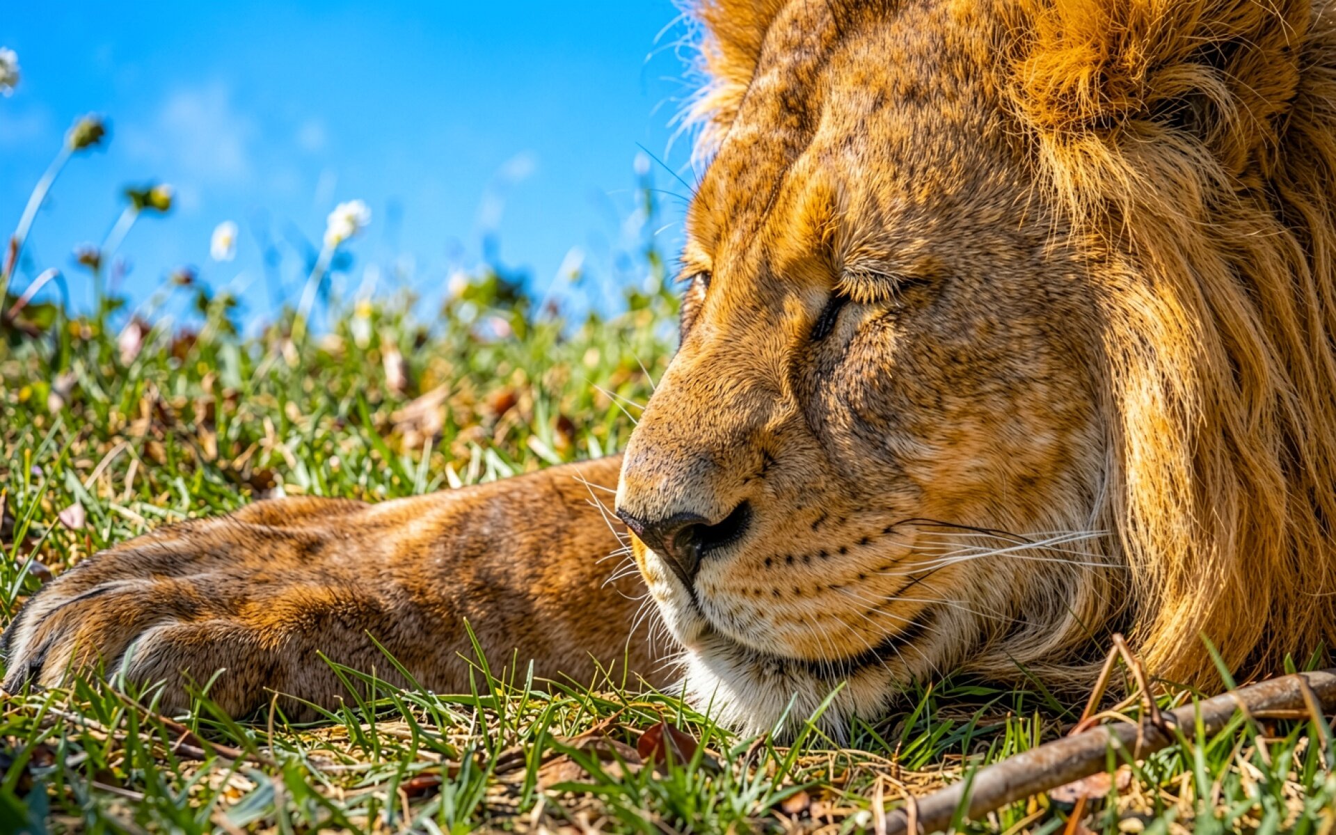 Лев с закрытыми глазами на зеленой траве обои