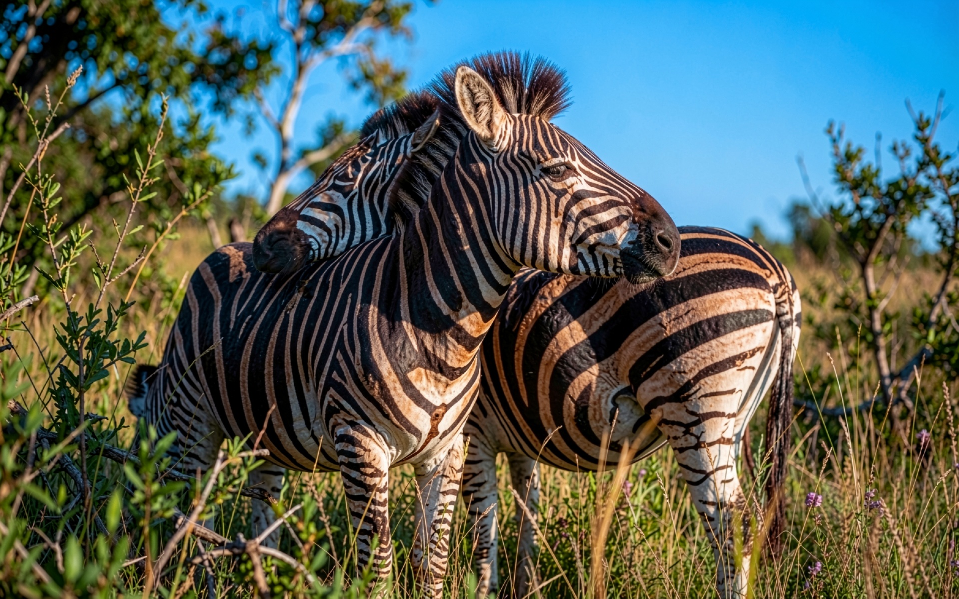 Две зебры в саванне солнечный день обои