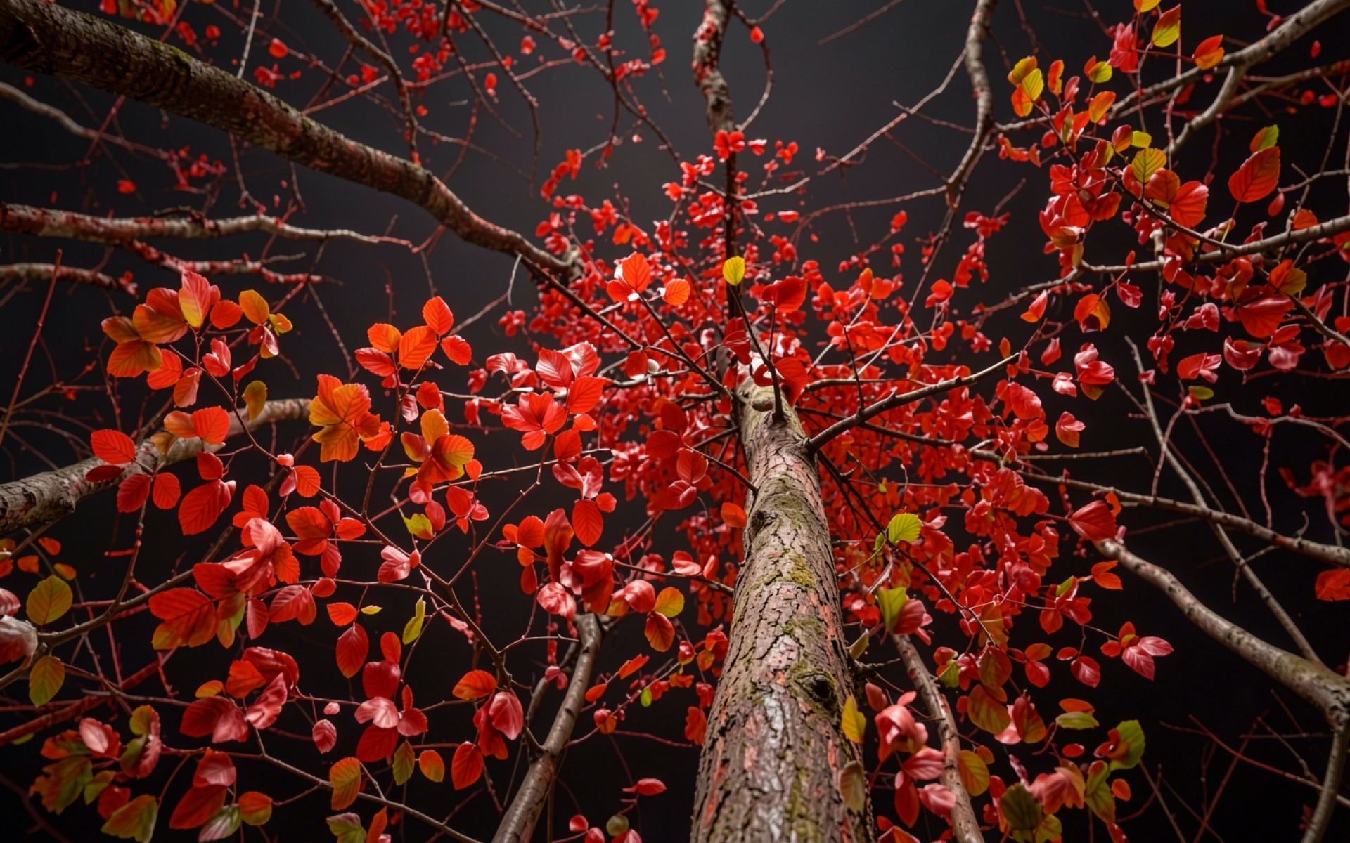 Изображение выделяется насыщенным алым оттенком листвы, которая контрастирует с глубоким темным градиентом заднего плана. Текстура коры дерева передана детально, с акцентом на вертикальные линии и естественные шероховатости. Освещение создает мягкие блики на поверхности листьев, подчеркивая их форму и создавая объем за счет глубоких теней в кроне. Перед загрузкой на сайте доступен удобный предпросмотр для оценки качества отображения цветов на вашем экране.