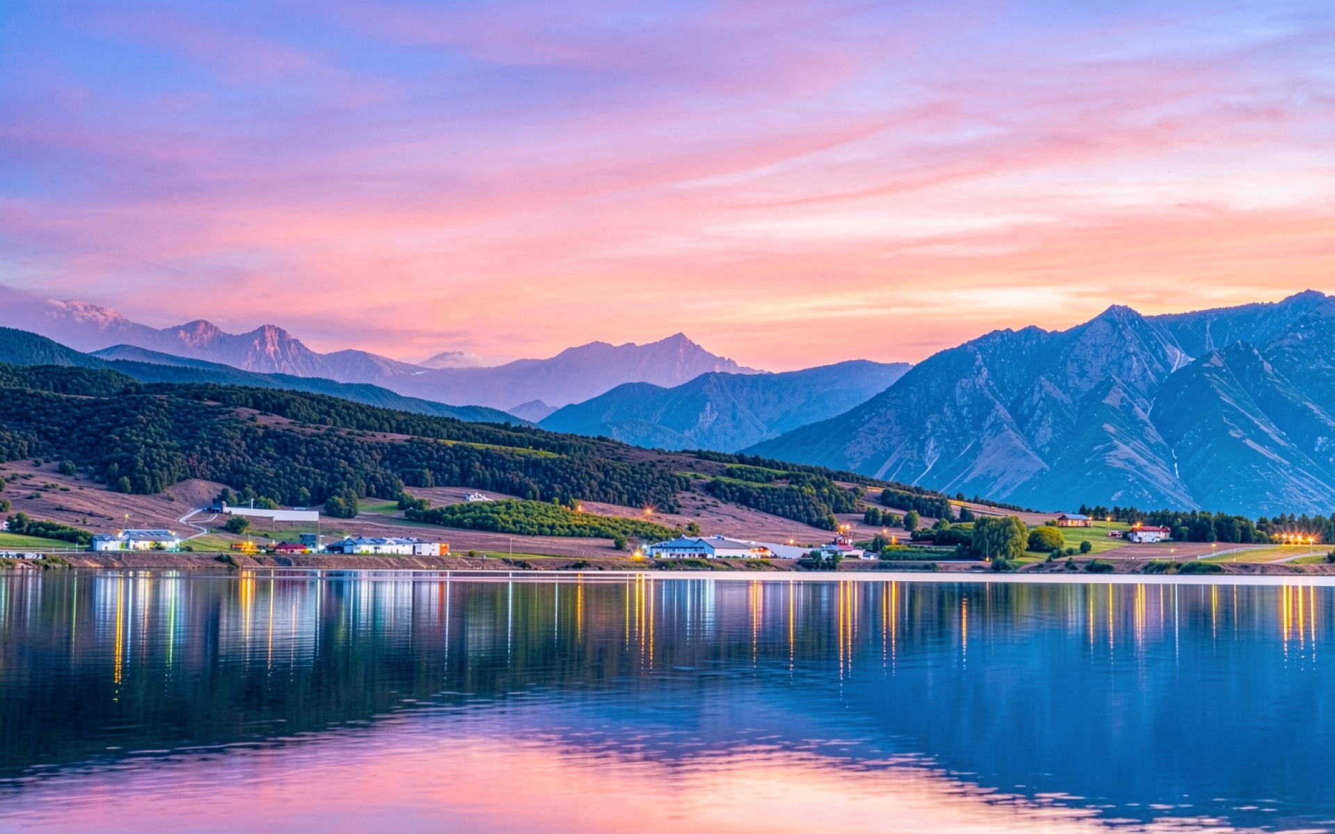 Изображение отличается детальной проработкой текстур горных склонов и плавными градиентами закатного неба. Освещение создает мягкие блики на поверхности воды, где отражаются огни прибрежных построек. Контраст между глубокими синими тенями гор и теплыми розовыми оттенками облаков подчеркивает объем сцены. Перед загрузкой на сайте доступен удобный предпросмотр для оценки качества отображения на вашем экране.
