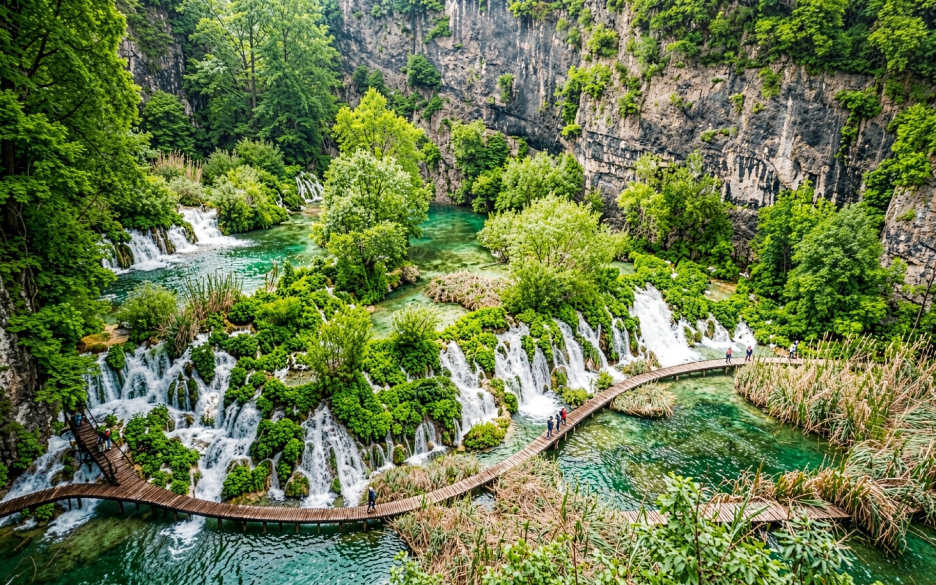 Водопады Плитвицкие озера бирюзовая вода зеленый лес обои