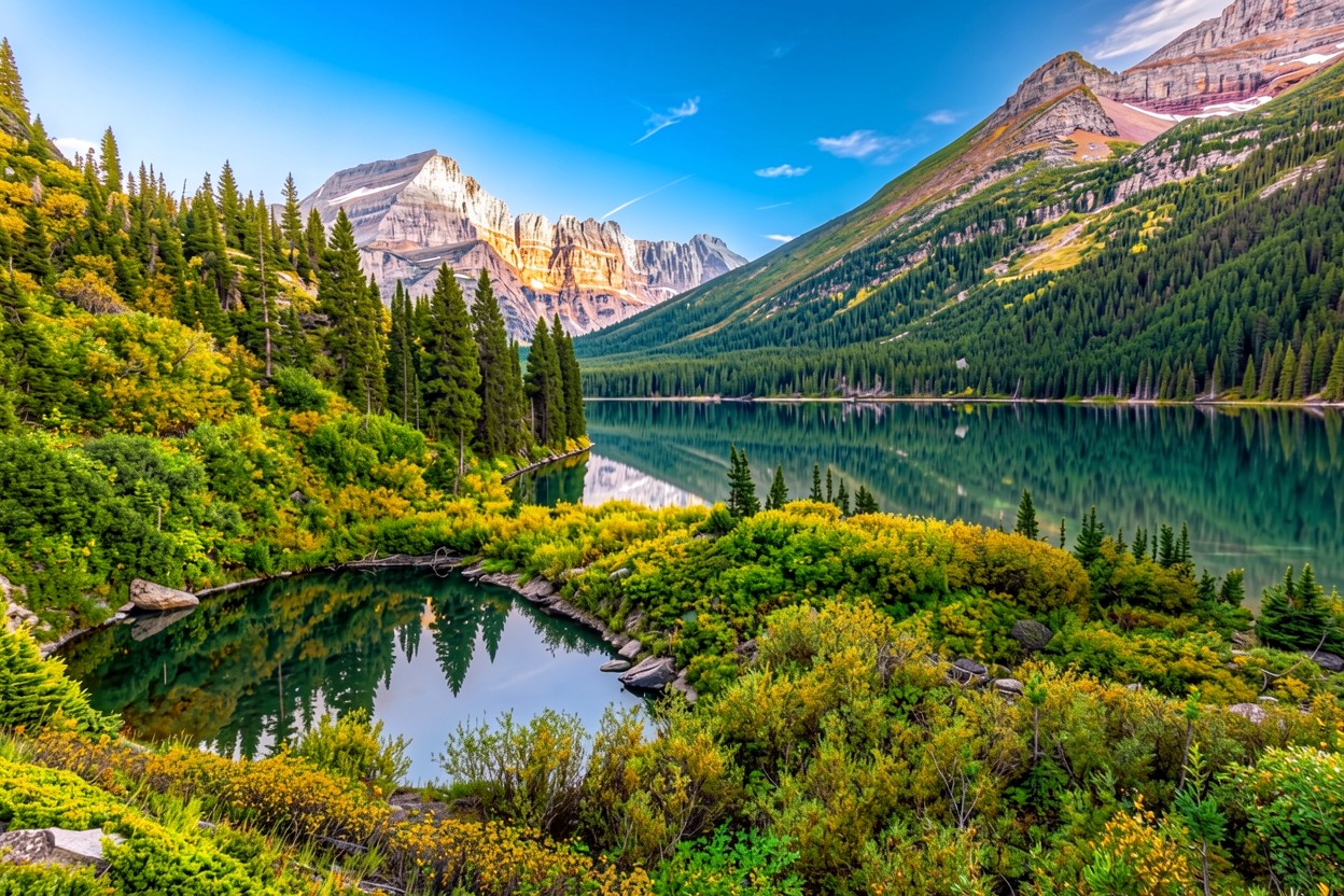 Изображение детально передает текстуру горных пород и густую зелень хвойных деревьев. Освещение распределено равномерно, создавая мягкие блики на поверхности воды и глубокие тени в складках скал. Плавные градиенты неба переходят в насыщенный синий цвет, а передний план с кустарниками подчеркивает объем композиции. На сайте предусмотрен удобный предпросмотр перед загрузкой, чтобы оценить качество отображения на вашем экране.