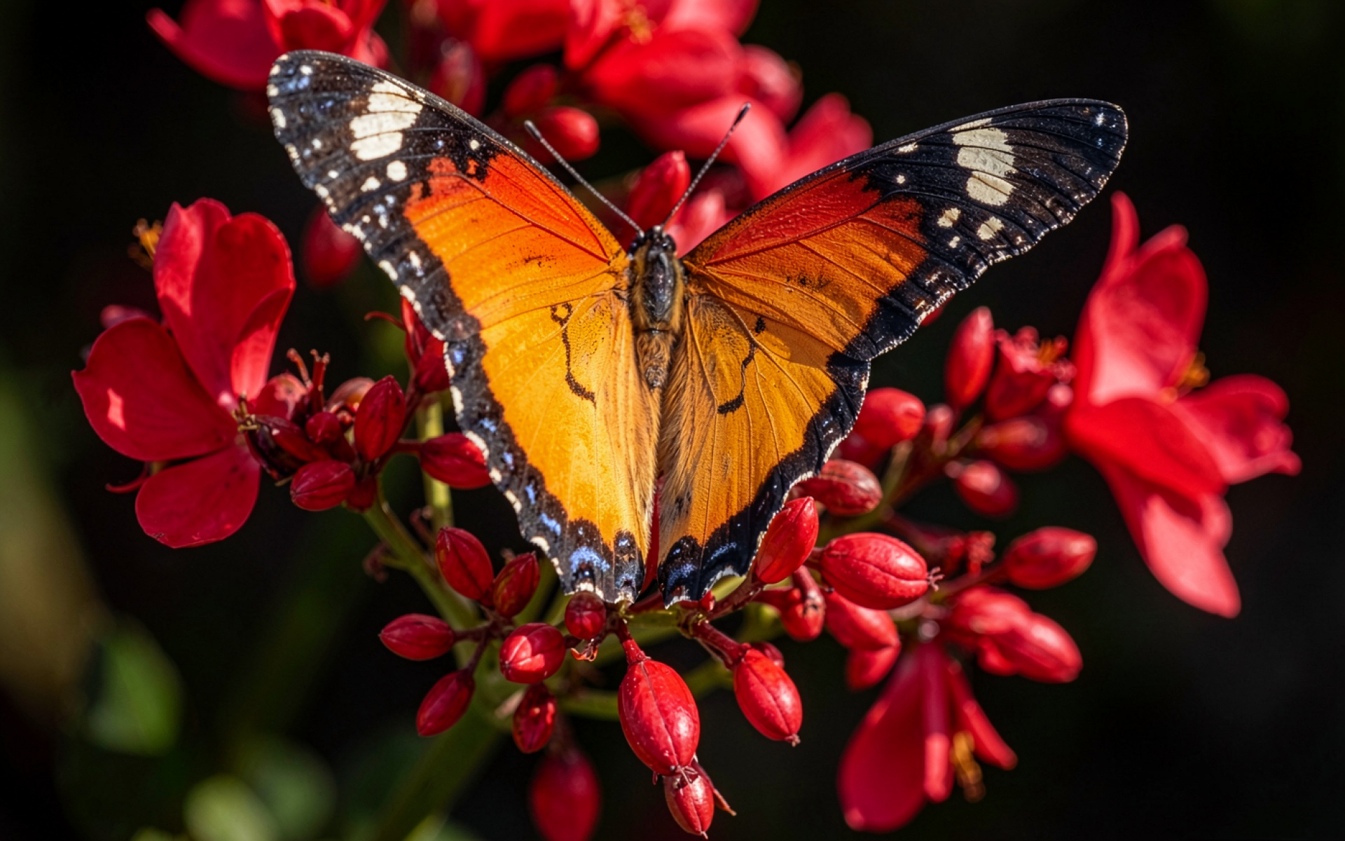 Оранжевая бабочка на ярко красных цветах обои