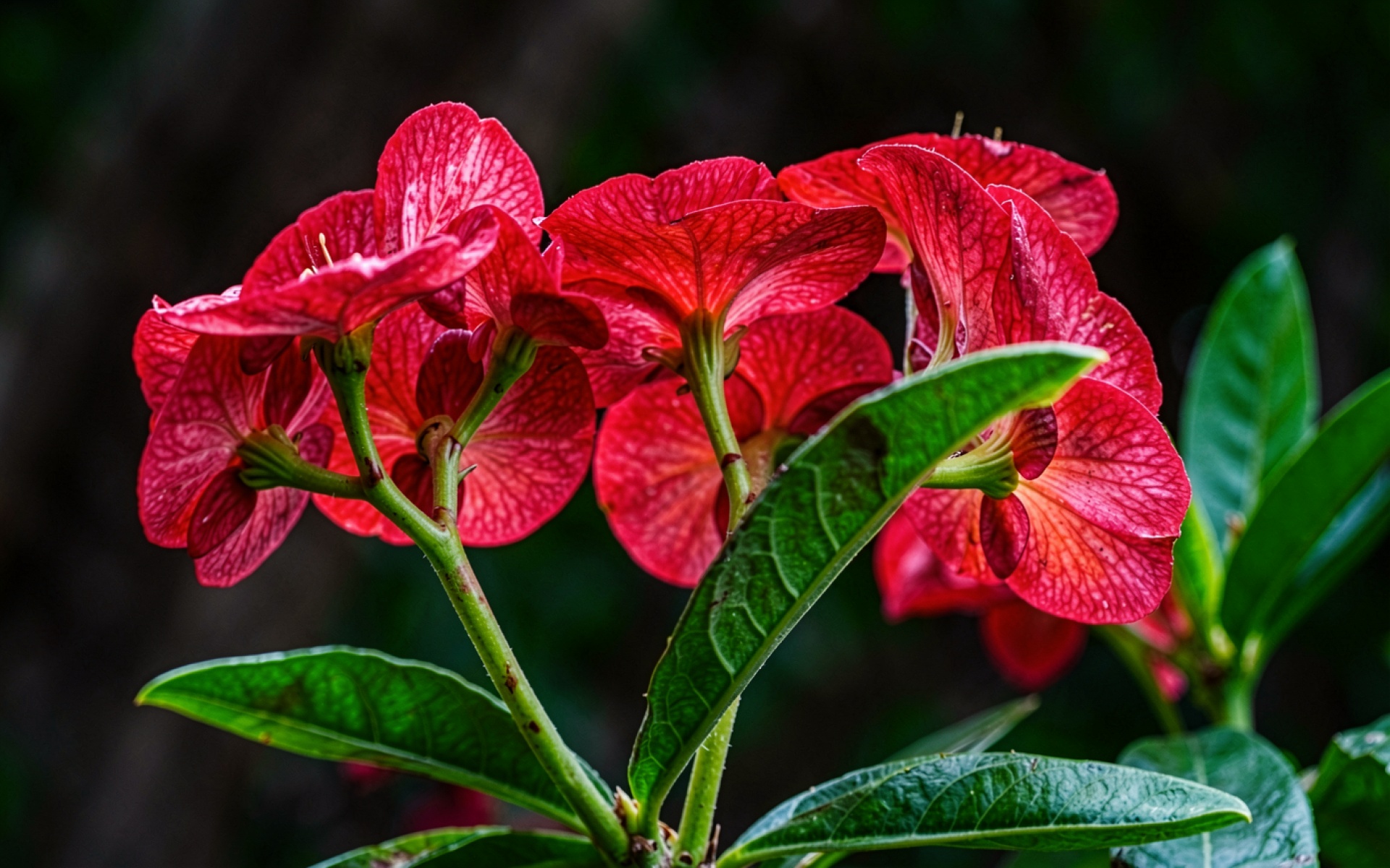 Красный цветок с прожилками на темном фоне обои