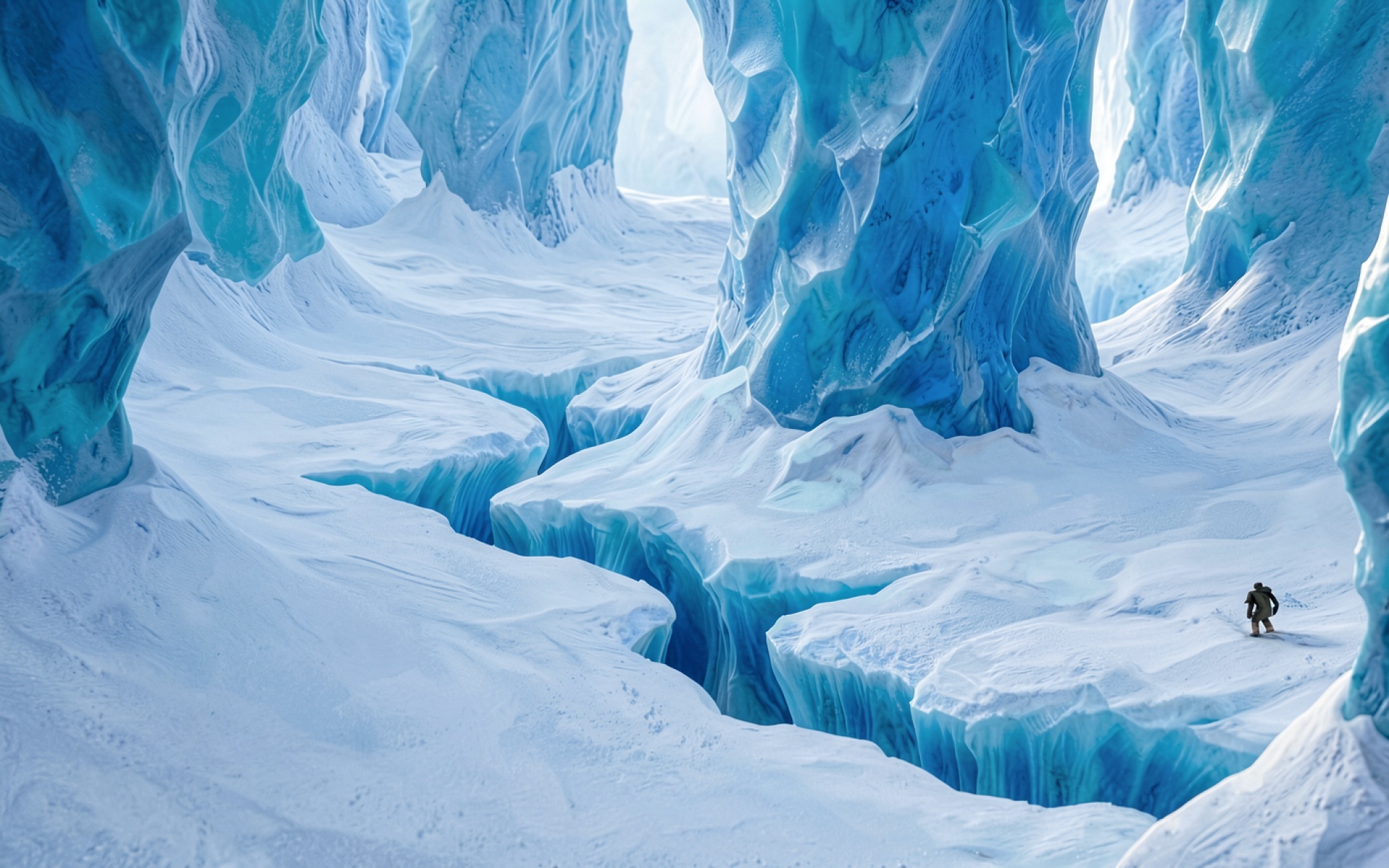 Ледяной каньон с голубыми стенами и человеком обои