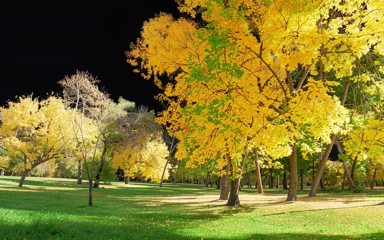 Изображение характеризуется высокой контрастностью между насыщенной листвой и глубоким черным фоном. Текстуры коры переданы четко, а градиенты света на траве создают объемную перспективу. Освещение подчеркивает теплые оттенки желтого, создавая выразительные блики на верхних ветвях и мягкие тени у основания стволов. На сайте доступен удобный предпросмотр перед загрузкой для оценки качества на экране.