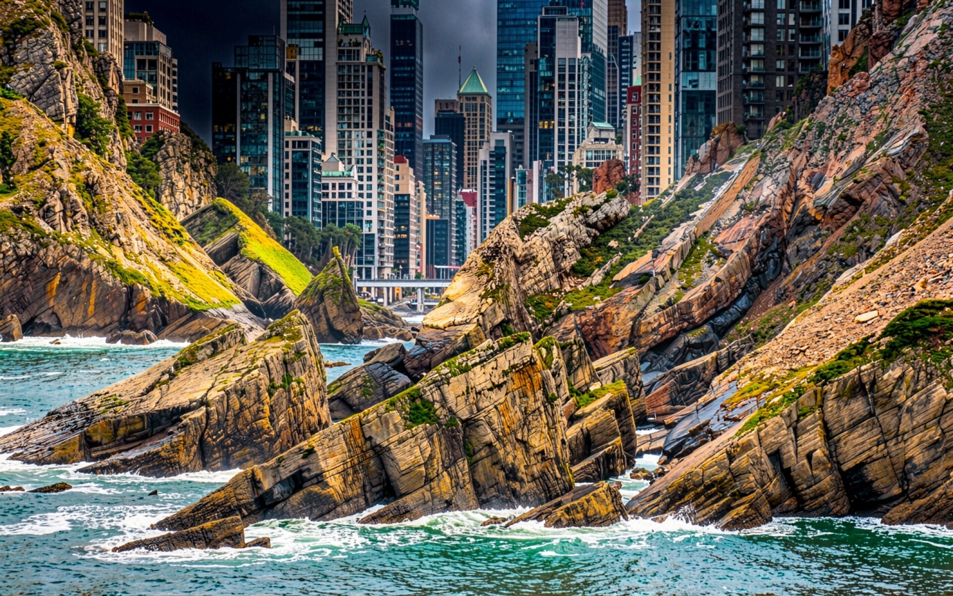 Скачайте JPG файл обоев Городские небоскребы за острыми скалами у океана на нашем сайте – и вот почему: изображение прошло минимальное сжатие, что позволило сохранить все мелкие детали.