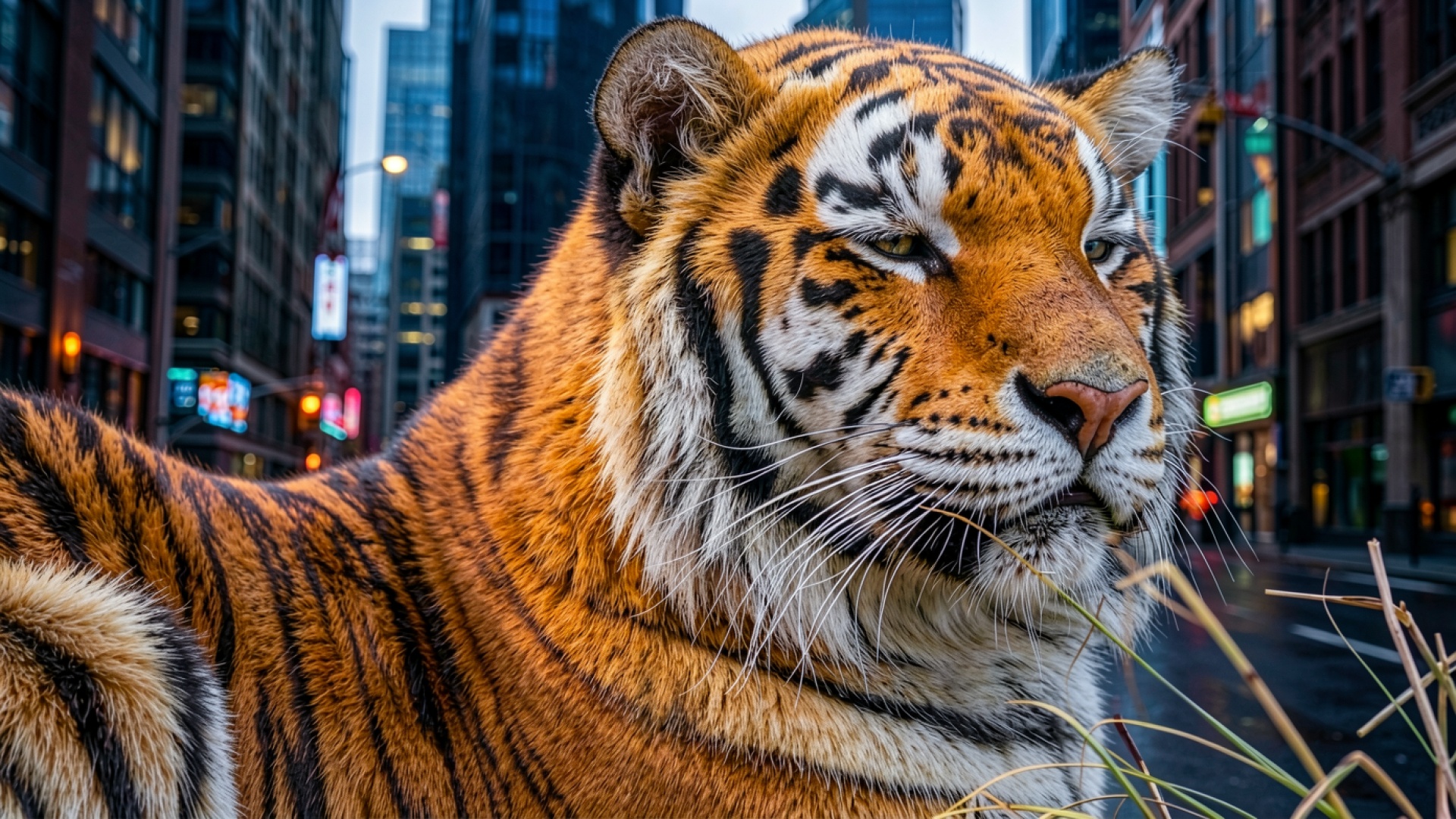 Наш ресурс дает вам возможность скачать обои Тигр в центре современного мегаполиса вечером в JPG, и причина в том, что другие сайты обрезают края, но у нас полный кадр.