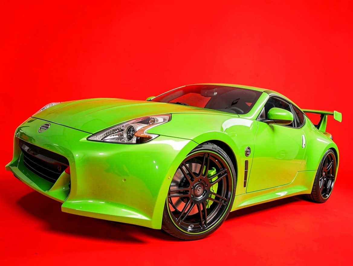 Доступны для скачивания JPG обои 'Зеленый спортивный автомобиль Nissan 370Z красный фон'. Почему стоит скачать именно их? Только этот JPG сохраняет метаданные цветокоррекции.