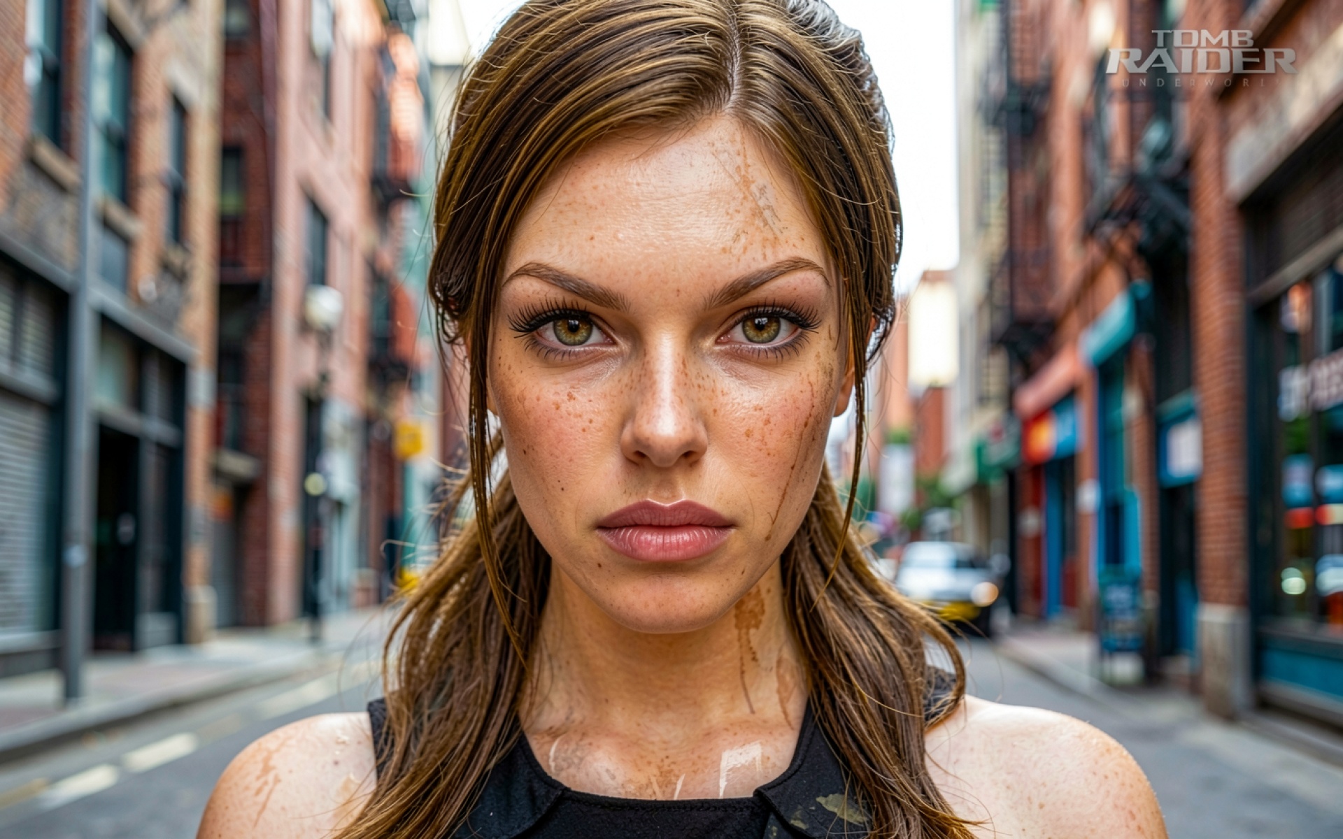 Изображение детально передает текстуру кожи с веснушками и следами грязи, что создает эффект присутствия. Освещение в сцене рассеянное, характерное для узких городских пространств, с мягкими градиентами на заднем плане и акцентированными бликами в глазах персонажа. Контраст между темной одеждой и кирпичными стенами подчеркивает глубину кадра. Перед загрузкой доступен удобный предпросмотр для оценки качества отображения на вашем экране.