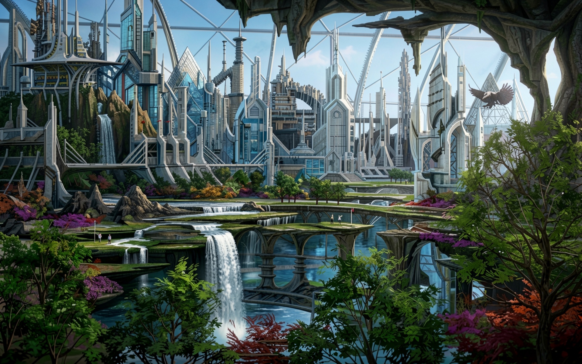 Скачайте с нашего сайта обои Футуристический город с водопадами в светлых тонах в формате JPG, так как эта JPG версия сохраняет все оттенки теней и света.