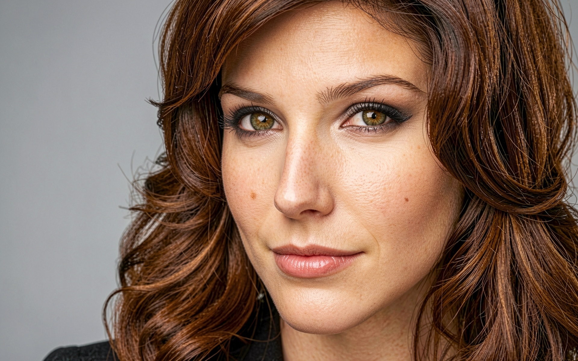 Изображение отличается детальной проработкой текстуры кожи и отдельных прядей волос. Мягкое фронтальное освещение создает плавные переходы теней на скулах и подчеркивает блики в глазах. Нейтральный серый градиент фона исключает цветовые искажения основного объекта, обеспечивая правильный баланс белого. Перед загрузкой доступен удобный предпросмотр для оценки качества отображения на вашем экране.