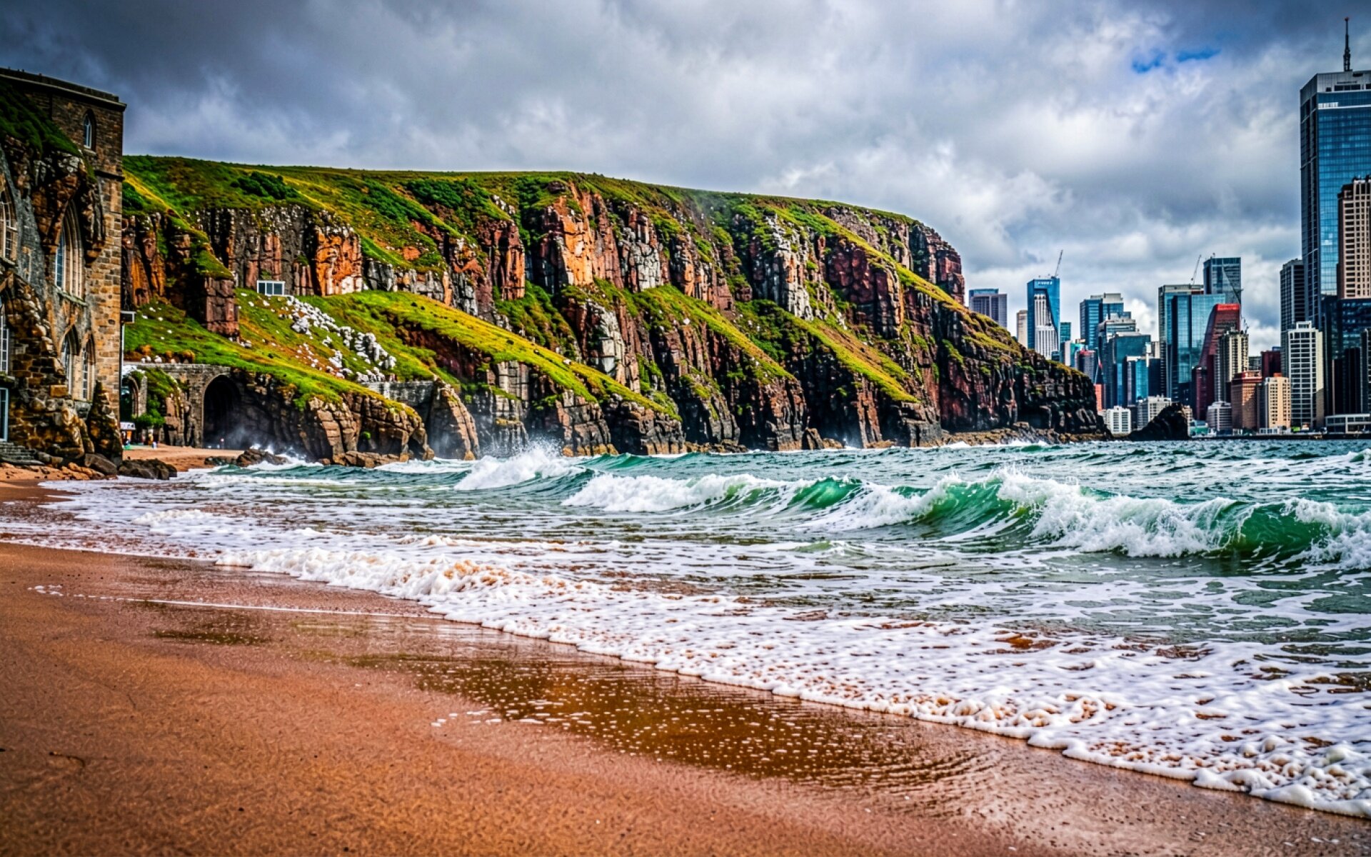 Изображение характеризуется высокой детализацией текстур мокрого песка и пены прибрежных волн. Освещение распределено равномерно, создавая мягкие переходы между темными участками скал и светлыми градиентами облачного неба. Контраст между природным рельефом утесов и строгими линиями городских небоскребов подчеркивается глубокими тенями в расщелинах камня. На сайте доступен удобный предпросмотр перед загрузкой для оценки качества на экране.