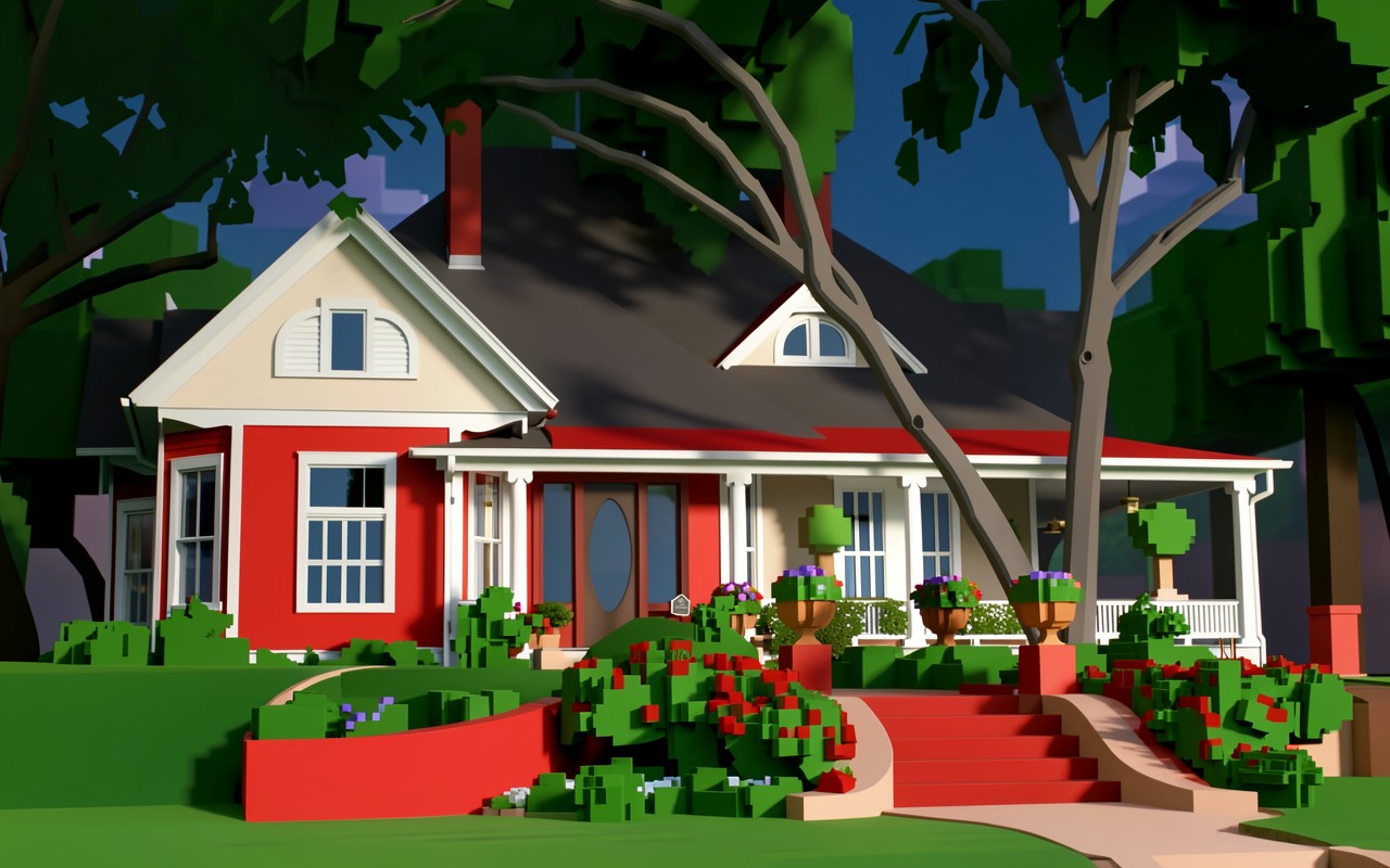 Композиция базируется на полигональном моделировании с использованием контрастных красных и зеленых оттенков. Освещение имитирует предзакатный час, создавая глубокие тени на фасаде здания и в кронах деревьев. Сцена включает детализированный ландшафт с кустами роз и декоративными вазонами.