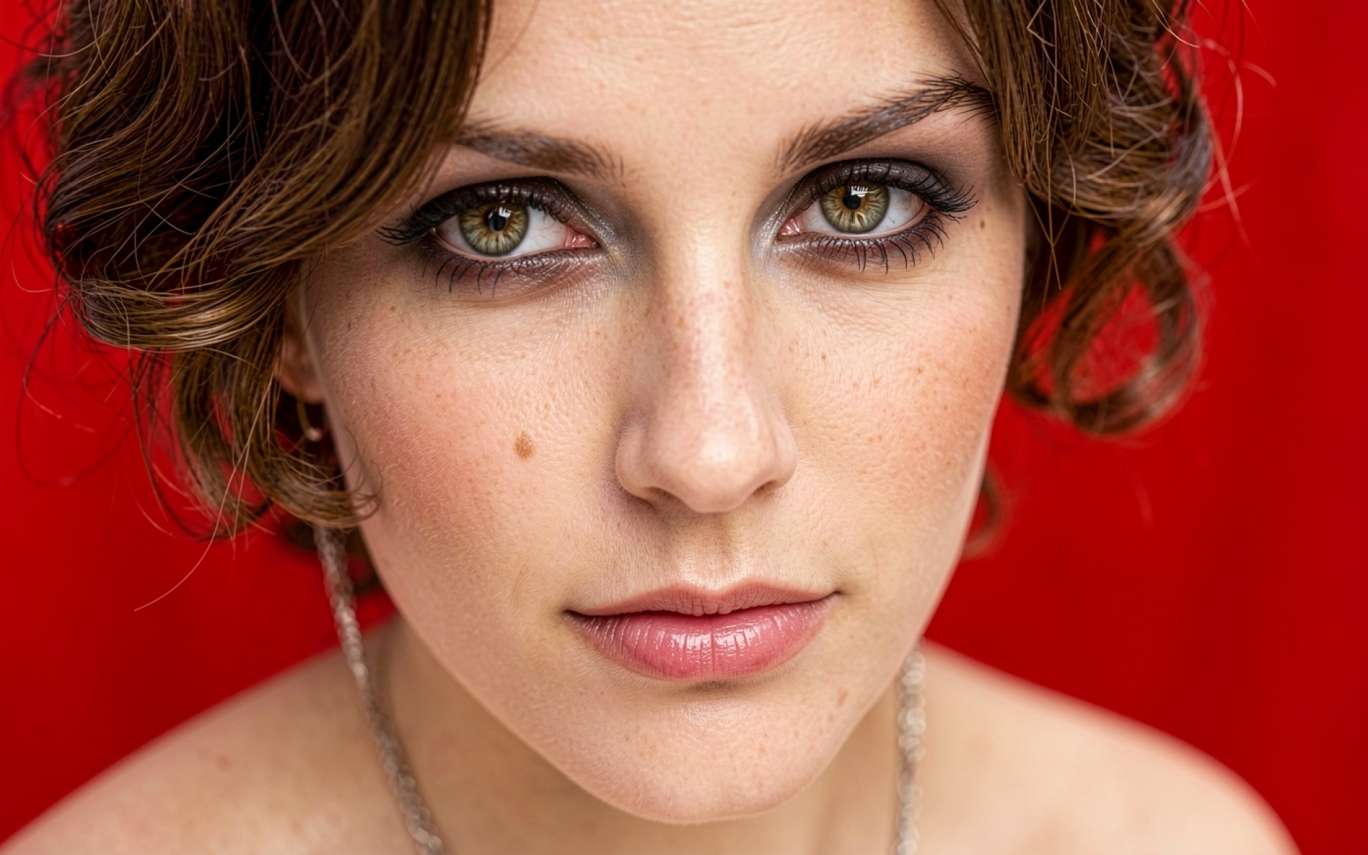 Изображение отличается детальной проработкой текстуры кожи и естественным распределением веснушек. Освещение создает мягкие блики на губах и радужке глаз, при этом глубокие тени подчеркивают контуры лица. Насыщенный красный градиент заднего плана создает резкий контраст с тонами кожи. Перед загрузкой на сайте доступен удобный предпросмотр для оценки качества отображения на вашем экране.