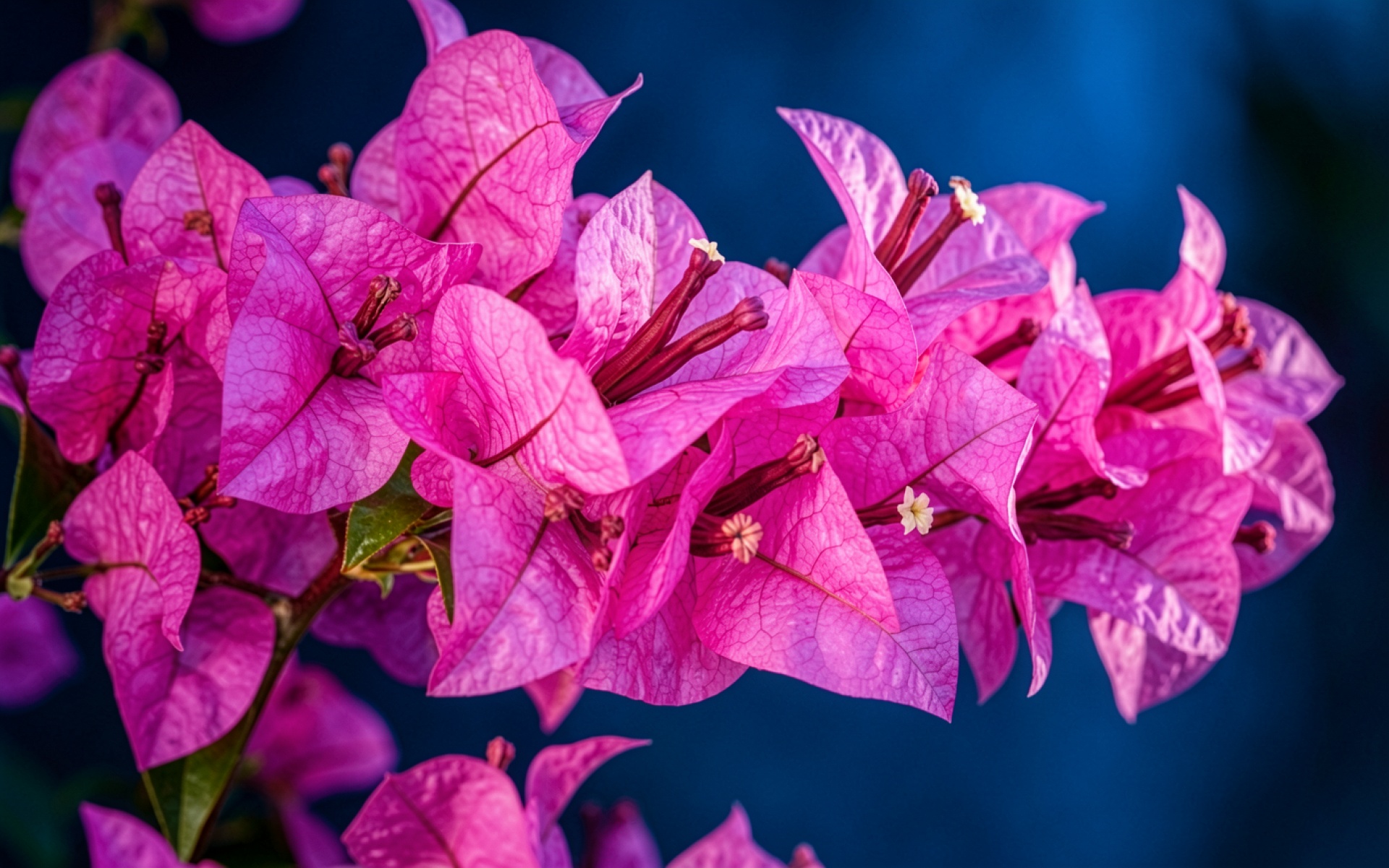 Розовые цветы бугенвиллеи на темно-синем фоне обои