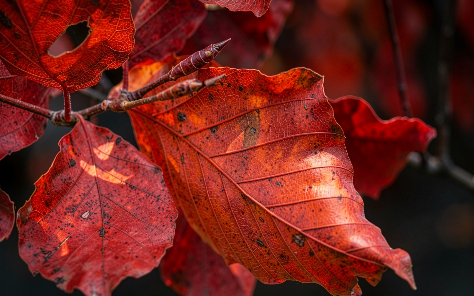 Доступны для скачивания JPG обои Красные осенние листья на темном фоне. Почему стоит скачать их? Другие сайты обрезают края, но у нас представлен полный кадр.