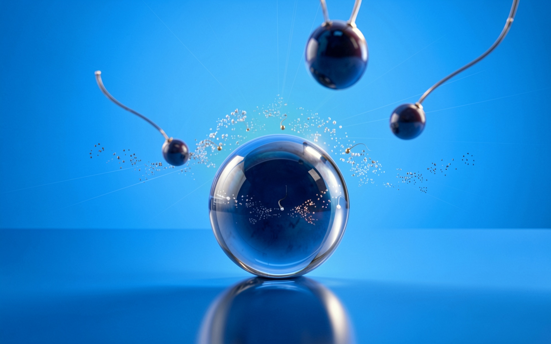 Изображение характеризуется высокой детализацией глянцевых поверхностей и плавными градиентами синего фона. Особое внимание уделено преломлению света внутри центральной сферы, созданию четких бликов на металлических элементах и мягким переходам теней в нижней части композиции. Текстура стекла передает ощущение глубины и прозрачности, а окружающие мелкие частицы добавляют динамики сцене. На сайте доступен удобный предпросмотр перед скачиванием, чтобы оценить качество отображения на вашем экране.