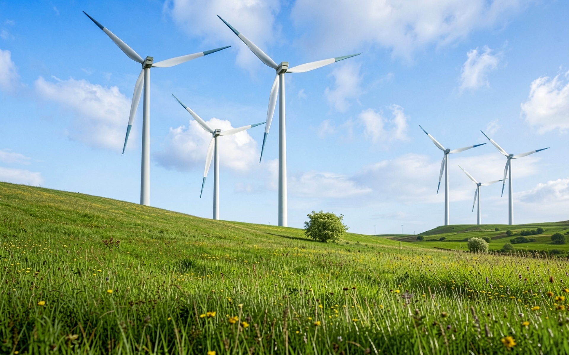 Изображение демонстрирует гладкие поверхности лопастей и матовые текстуры опорных мачт. Освещение имитирует яркий солнечный день, создавая четкие блики на кромках турбин и глубокие естественные тени на склоне холма. Фон характеризуется плавным переходом голубых оттенков неба с мягкими белыми облаками. На сайте доступен удобный предпросмотр перед скачиванием для оценки качества на экране