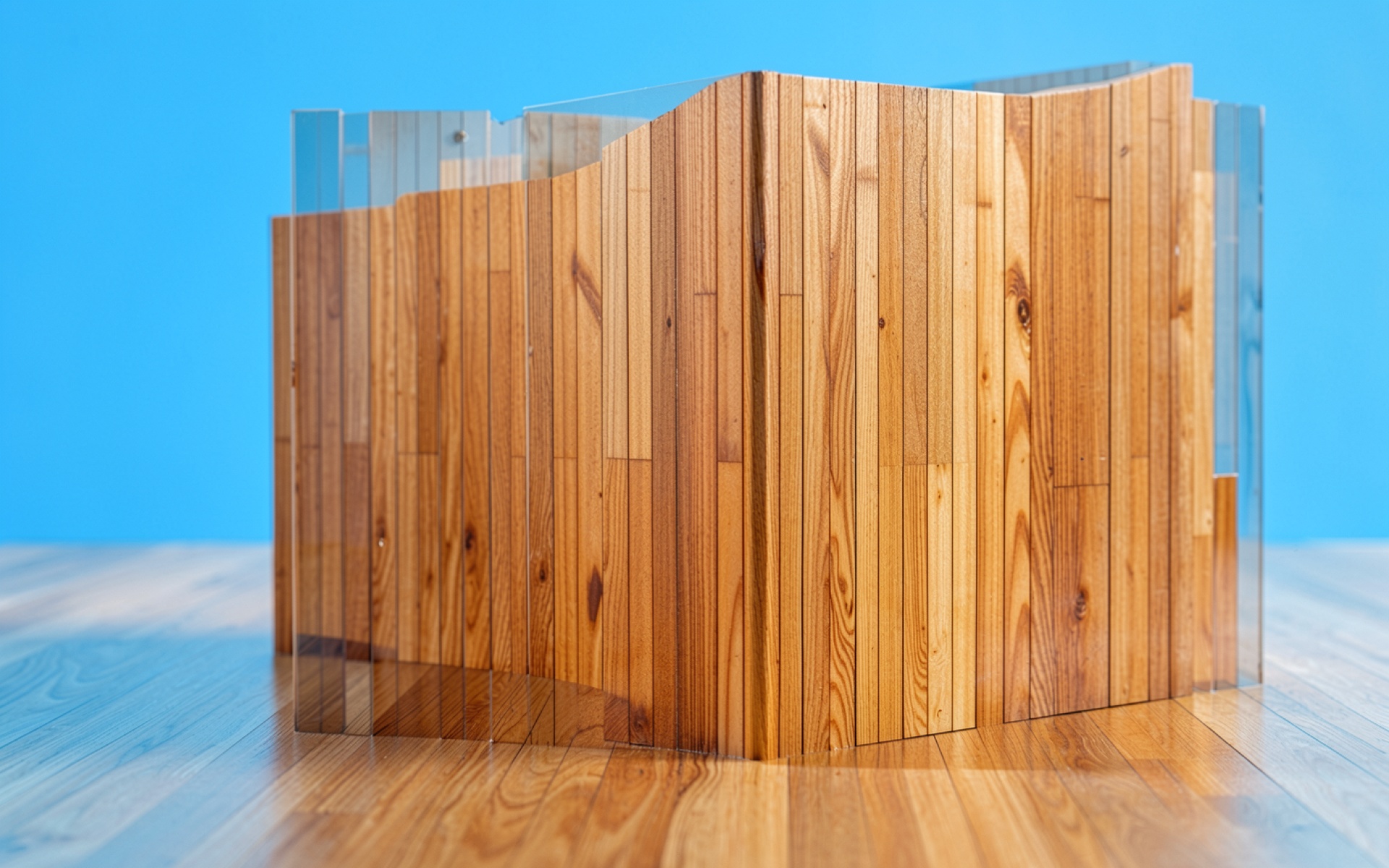 Изображение демонстрирует детальную текстуру светлого дерева с выраженными вертикальными волокнами и природными узлами. Освещение создает мягкие блики на стеклянных поверхностях, которые окружают объект, формируя четкие границы и глубокие тени в местах соприкосновения материалов. Фон представляет собой ровный голубой градиент, который контрастирует с теплыми оттенками древесины. На сайте доступен удобный предпросмотр перед скачиванием для оценки качества на экране.